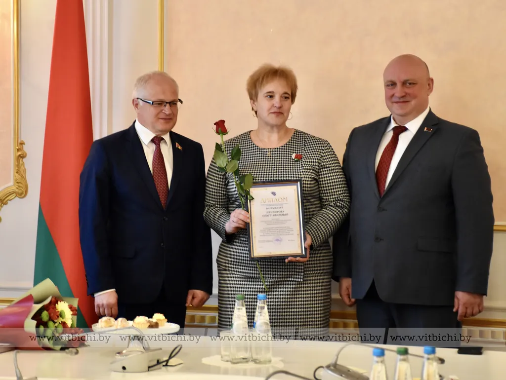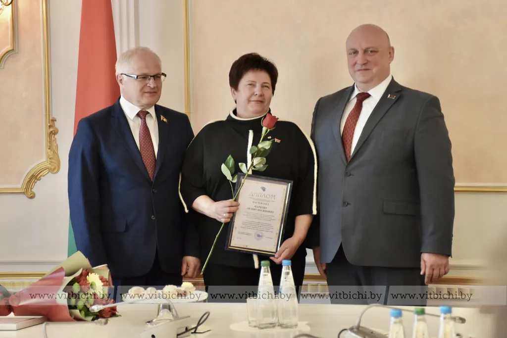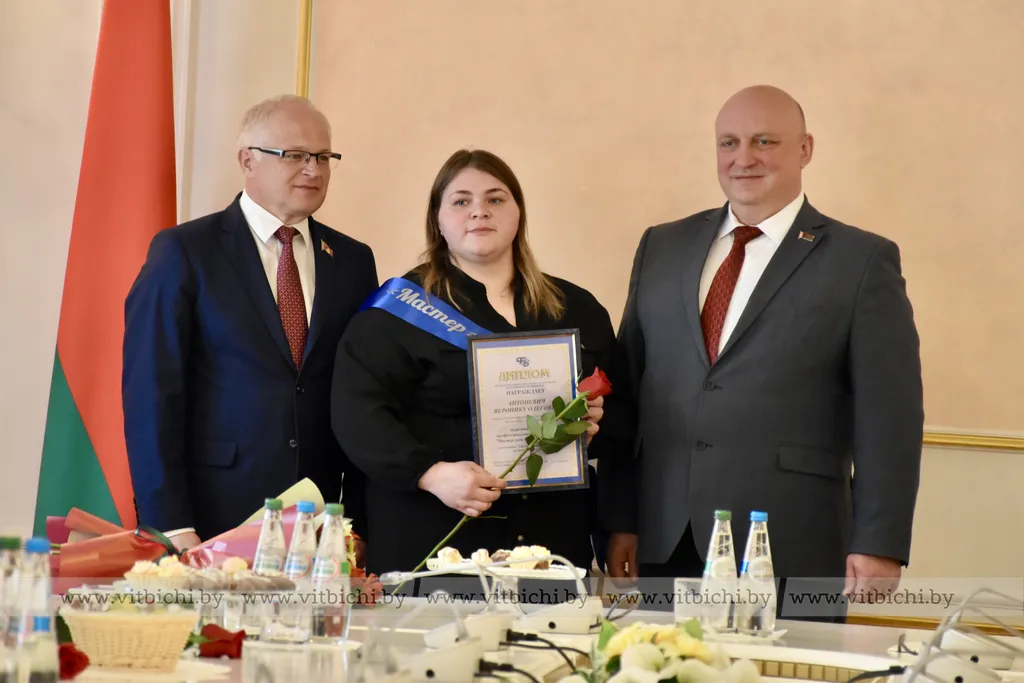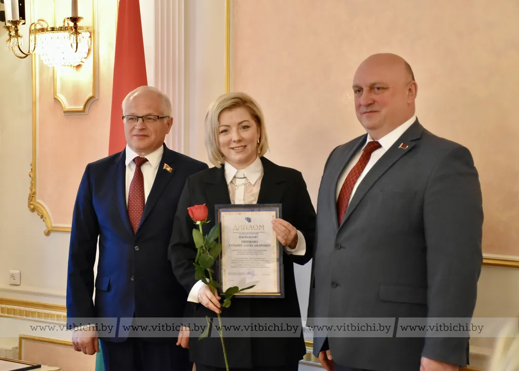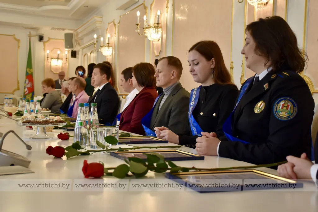 Дмитрий Демидов и председатель Витебского областного объединения профсоюзов Юрий Деркач вручили награды 17 лауреатам конкурса – работникам образования, здравоохранения, сельского хозяйства, торговли, строительства, газовой и топливной промышленности, энергетики, нефтехимической и других отраслей.