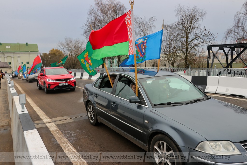 Руководители области, города и мостостроительного управления № 5 перерезали красную ленточку, и новые автобусы, а затем и участники автопробега общественного объединения «Патриоты Беларуси» открыли движение по обновленному путепроводу.
