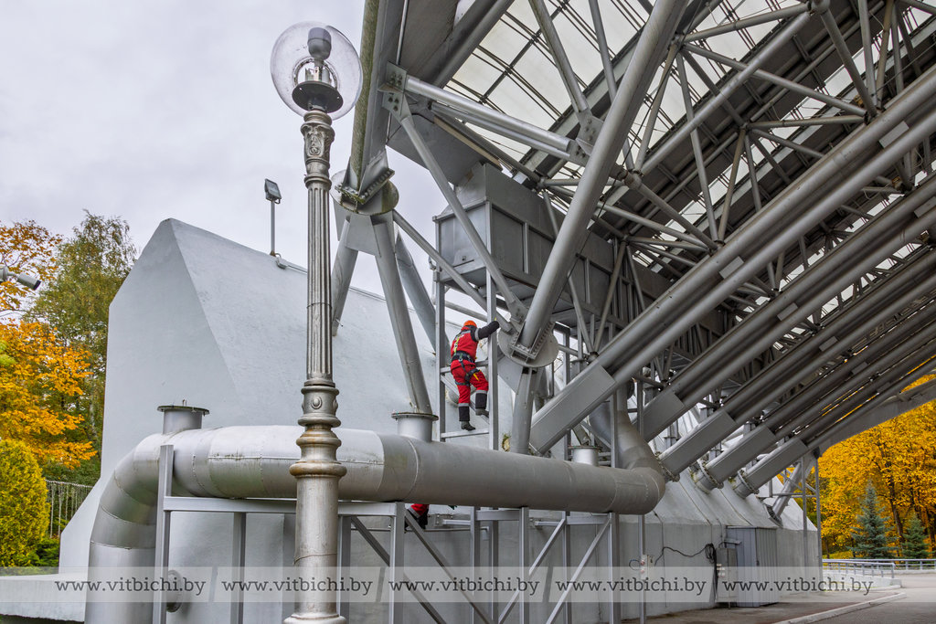 – Чаша расположена в низине, из-за этого на ней накапливается больше грязи, которую приносят ветер, дождь или снегопад. На такой большой площади могут накопиться несколько тонн мусора. Плюс разрушающий эффект за много лет оказывает солнце. Все это может сказаться на прочности материалов. Поэтому сейчас все аккуратно промоем пескоструем. Потом зачистим метал и покрасим. Это позволит уберечь конструкцию от коррозии, – пояснил Евгений Ловейко.