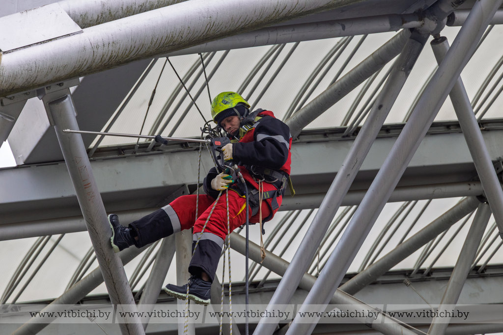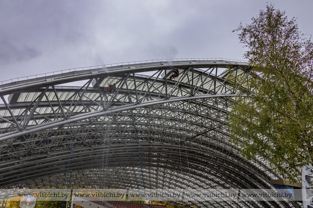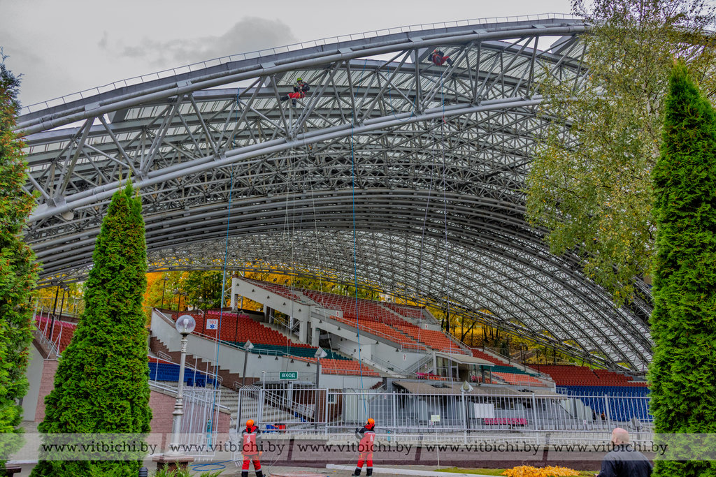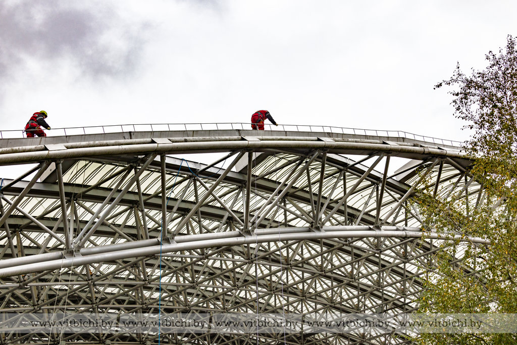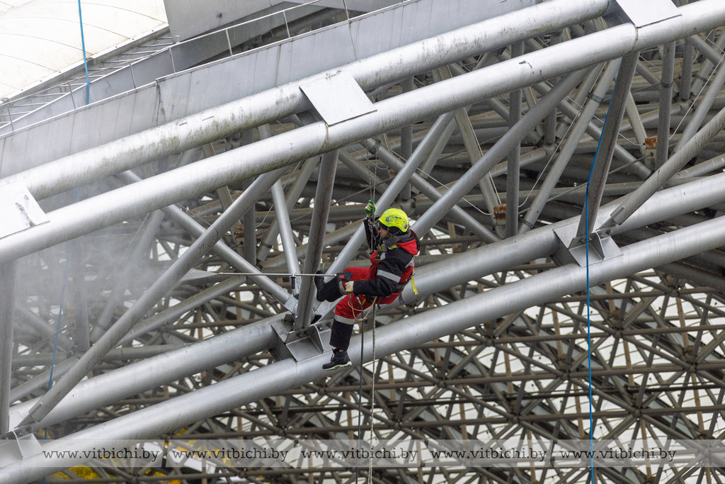 – Мы много лет занимаемся работами на высотных зданиях, крышах хранилищ, трубах заводов и фабрик, но нынешний объект для нас серьезный вызов. Прекрасно понимаем, что амфитеатр не только лицо Витебска, но и всей страны. Для работы сюда мы привлекаем только самых опытных и высококлассных специалистов, которых между собой называем «золотая четверка», – рассказала директор ЧТУП «АНАКОНДА ПРОФИ» Дарья Черноус.