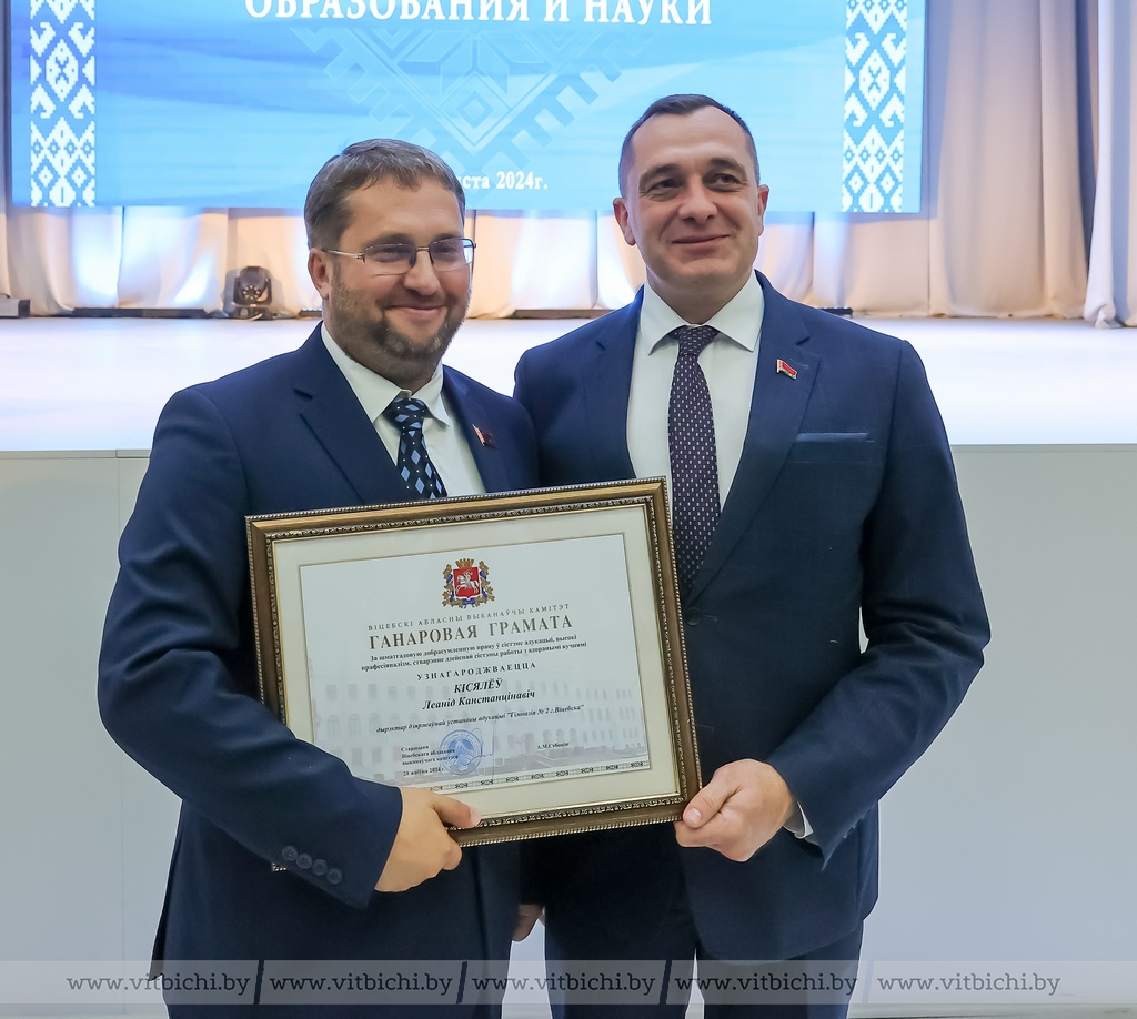 Александр Субботин вручил представителям системы образования Почетные грамоты облисполкома за высокие показатели в обучении и воспитании учащихся. Среди награждённых директор гимназии номер 2 г. Витебска Константин Киселев, учащиеся которой достойно представили Беларусь на международной математической олимпиаде.