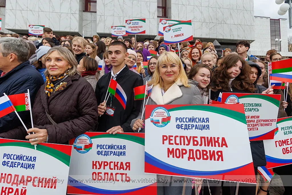 Перед началом торжественной церемонии открытия олимпиады «Два народа – история, культура, духовная общность» с ее более 200 участниками из примерно 30 команд из регионов России и Беларуси сфотографировался на память председатель Витебского облисполкома Александр Субботин.