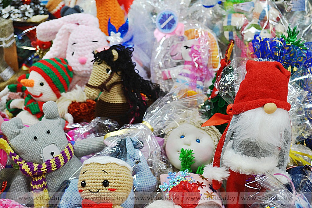 Волонтеры, студенты ВГУ имени П.М. Машерова, представляют посетителям новогодние игрушки и сувениры, изготовленные педагогами и учащимися учреждений образования Витебской области. Все изделия - качественно выполненные, яркие и привлекательные. Вырученные от продажи новогодних сувениров средства будут направлены на улучшение материальной базы детских социальных приютов.