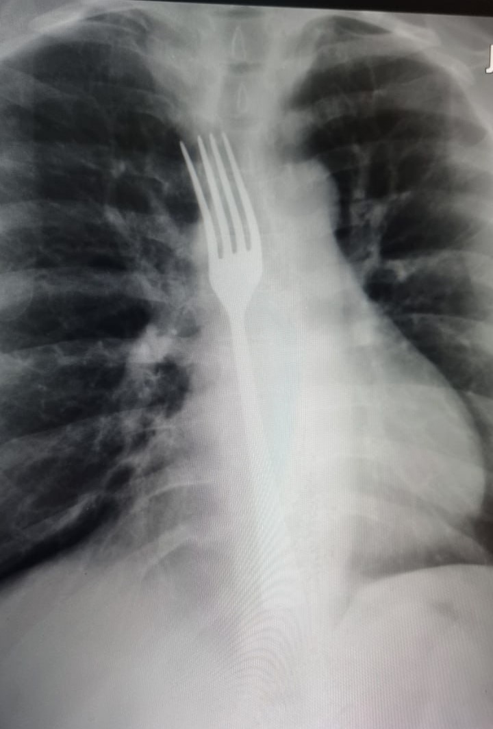 Необычный случай произошел в Витебской областной клинической больнице. Пациентка столкнулась с распространенной проблемой — «встал желудок». В попытке вызвать рвоту в домашних условиях она использовала черенок от вилки, но та застряла в пищеводе. Об этом рассказали в телеграм-канале "Витебская областная клиническая больница".