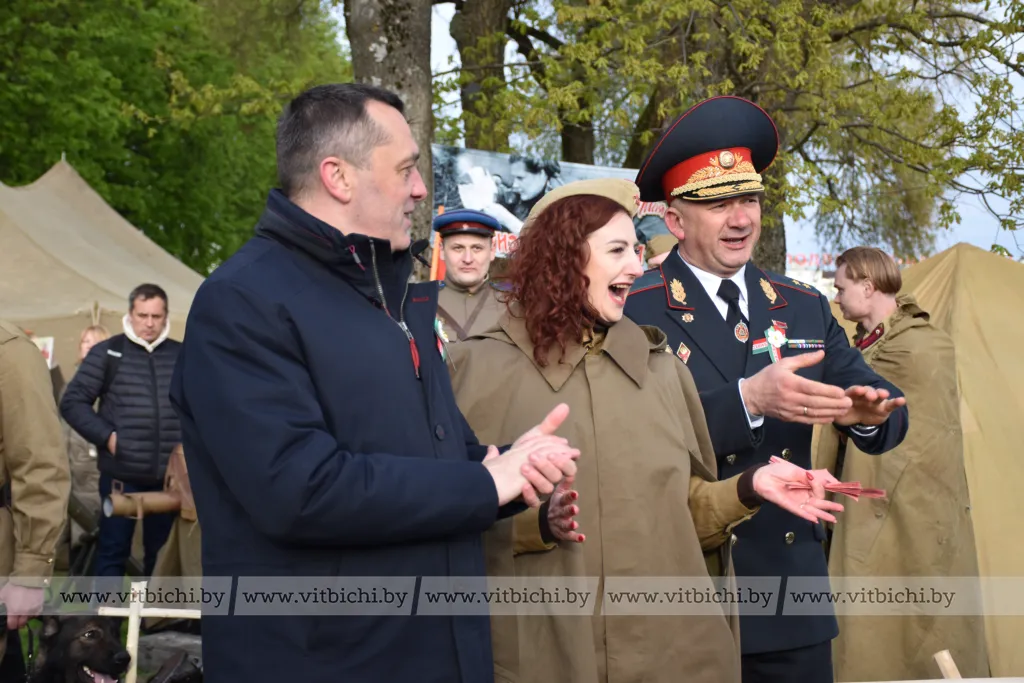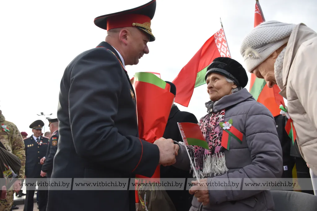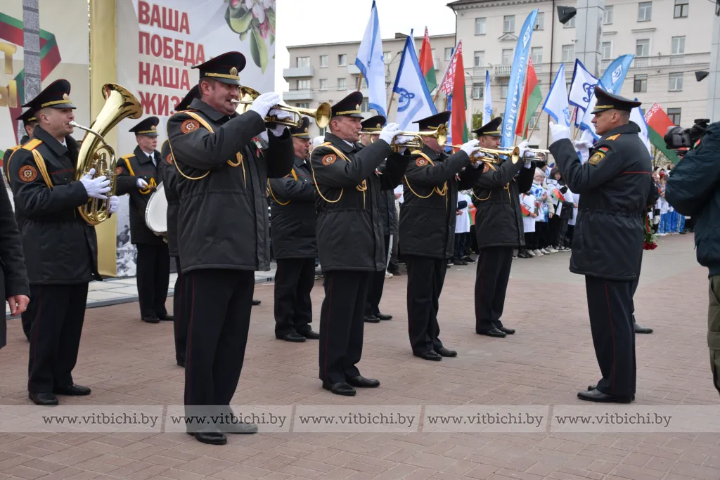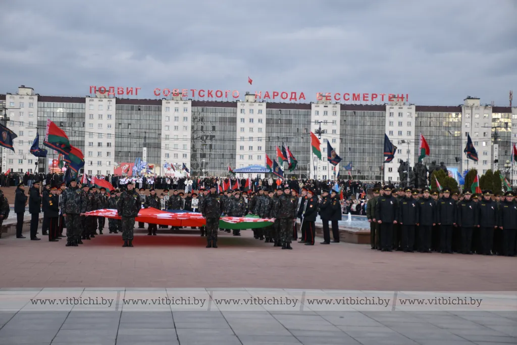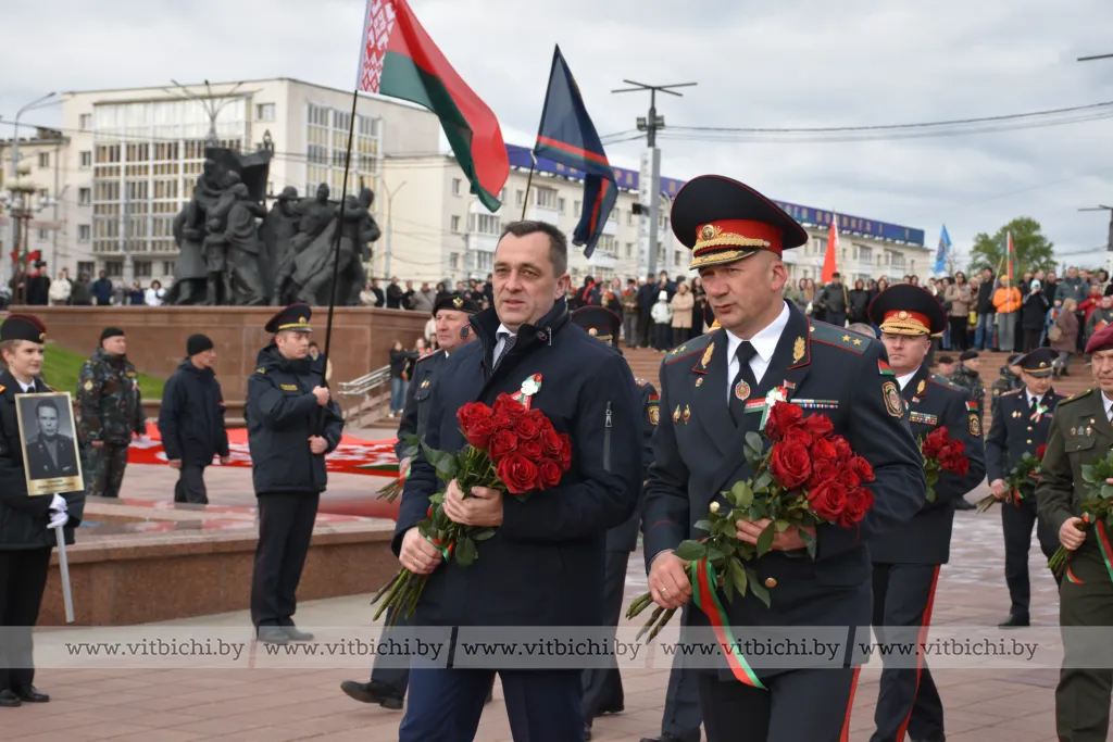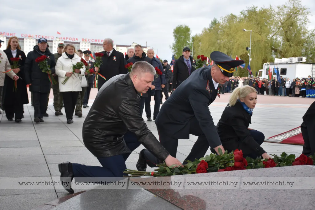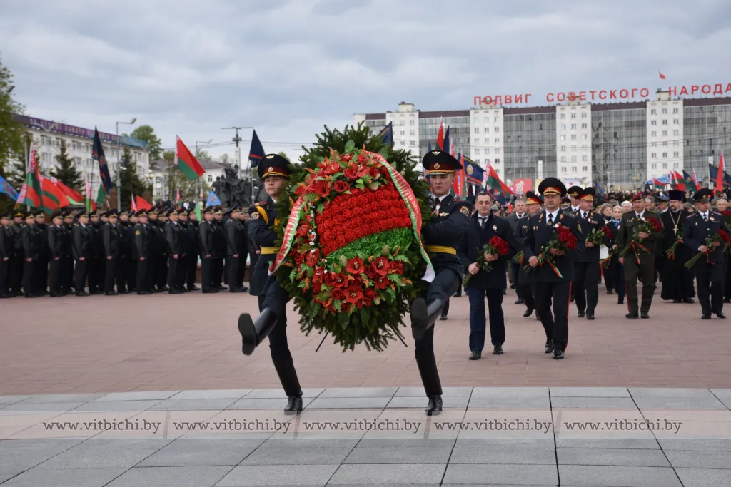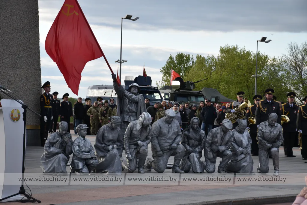 – День Победы – самый дорогой и главный для нас праздник. 80 лет мы живем под мирным небом в нашей родной Республике Беларусь, и мы отдаем дань памяти подвигу тех, кто приближал победу, кто погиб, отстаивая свободу, независимость, мир и спокойное небо для последующих поколений. Великая Отечественная война оставила незаживающие раны в сердцах наших людей. Омытая кровью солдат и офицеров, сегодняшняя площадь Победы остается священным местом для всех нас. Именно здесь в июне 1944 года прошел последний бой, после которого Витебск был освобожден от немецко-фашистских оккупантов. Мемориальный комплекс «Три штыка», воздвигнутый здесь в 1974 году, символизирует освобождение Витебщины воинами фронтов, партизанами и подпольщиками. Сюда в дни торжеств приходят к Вечному огню все новые и новые поколения жителей города и его гостей, и сегодня мы особенно чувствуем величие героизма павших за свободу.