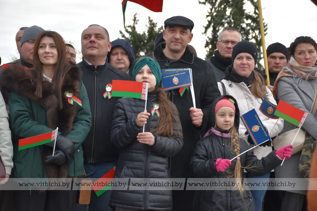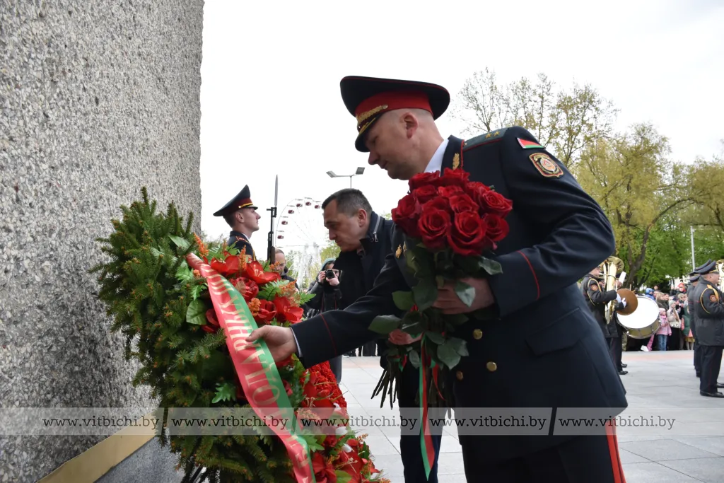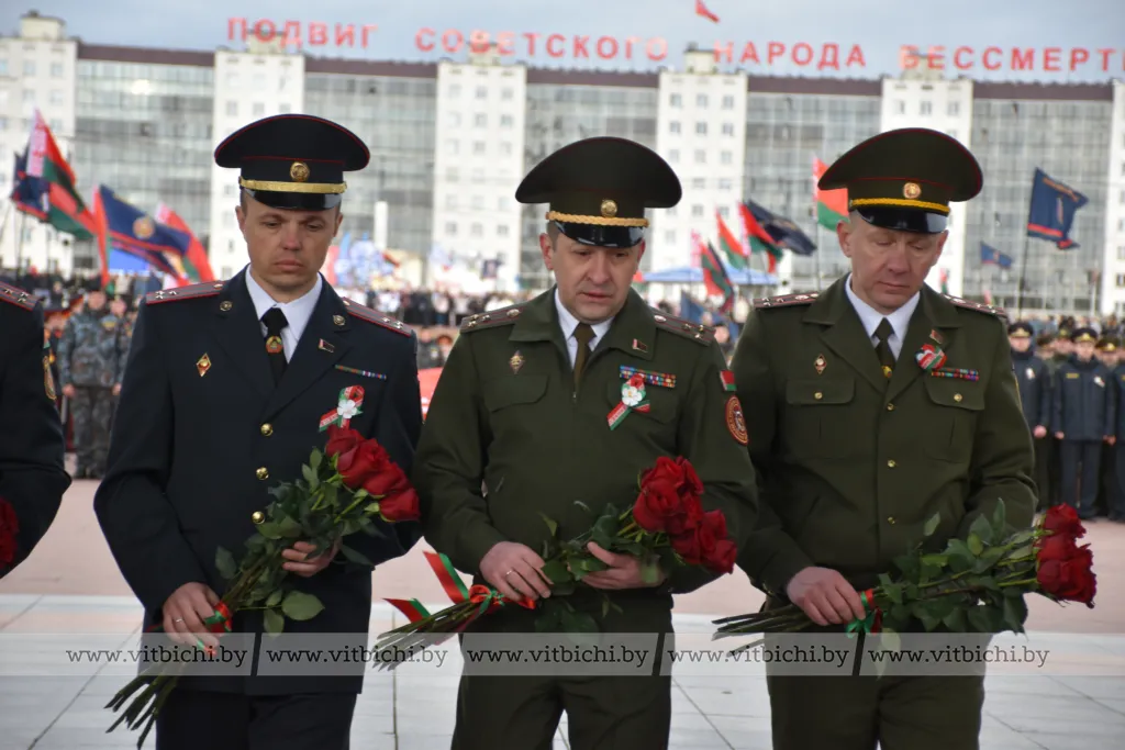 Когда начался торжественный митинг, даже хмурое небо вдруг очистилось от туч, и в «Трех штыках» мемориального комплекса засверкали яркие лучи вечернего солнца. Под звуки оркестра цветы и венки к Вечному огню возложили министр внутренних дел Республики Беларусь генерал-лейтенант милиции Иван Кубраков и его заместители, председатель Витебского облисполкома Александр Субботин, начальник УВД Витебского облисполкома полковник милиции Максим Суббота, председатель Витебского горисполкома Алексей Героев, представители общественности, духовенства, молодежи.