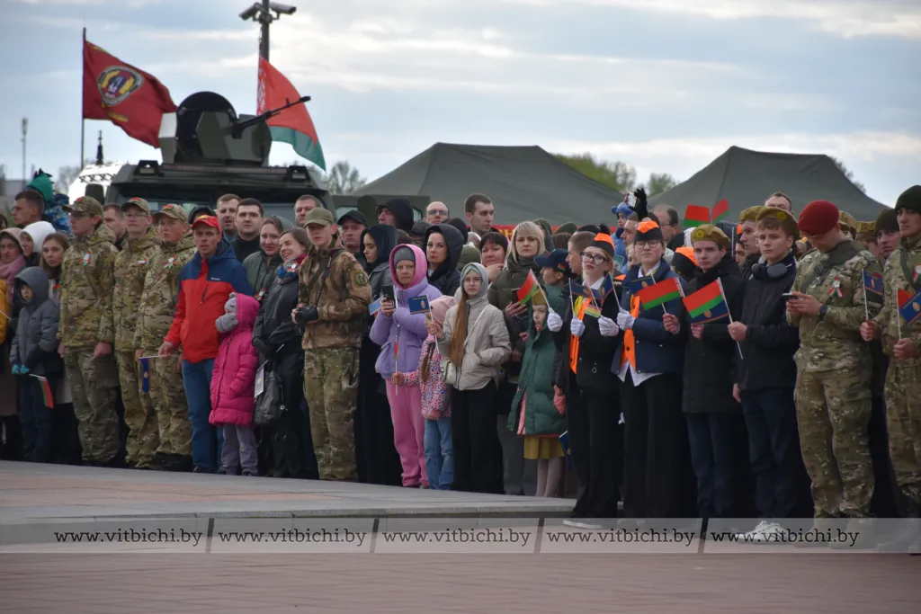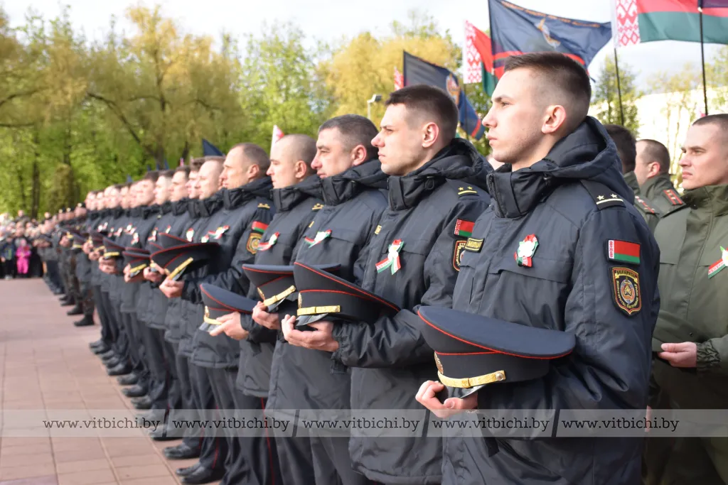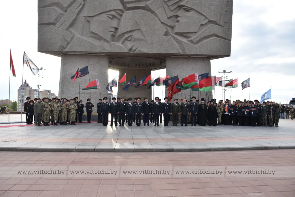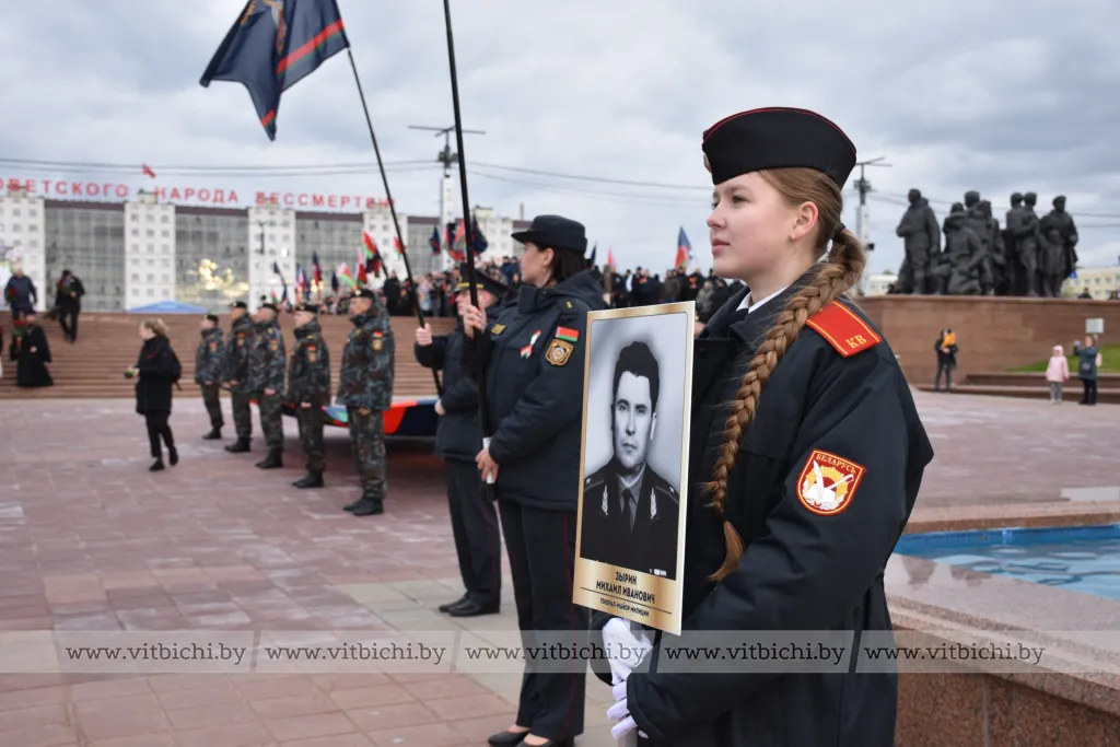 На главной площади областного центра, носящей имя Победы, собрались сотни и сотни горожан, чтобы отдать дань памяти подвигу советского народа в годы Великой Отечественной войны вместе с участниками автомотопробега. На площади – колонны сотрудников силовых структур, молодых сотрудников ОВД, кадеты, учащиеся витебских школ, студенты. Они пришли к Вечному огню, чтобы встретить почетных гостей, прибывших в Витебск в первый майский день с эстафетой патриотической акции.