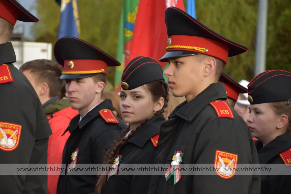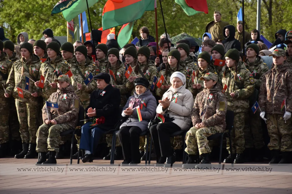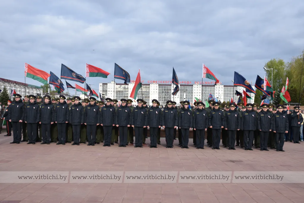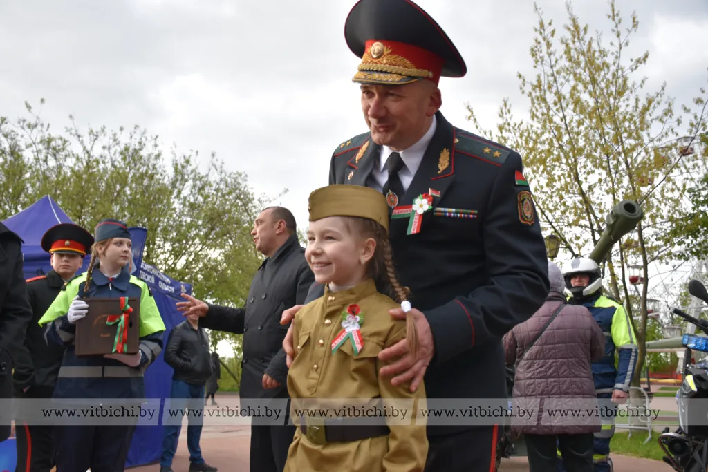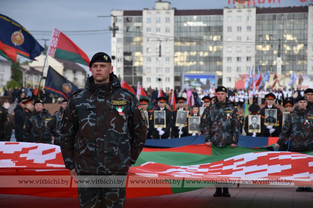 На главной площади областного центра, носящей имя Победы, собрались сотни и сотни горожан, чтобы отдать дань памяти подвигу советского народа в годы Великой Отечественной войны вместе с участниками автомотопробега. На площади – колонны сотрудников силовых структур, молодых сотрудников ОВД, кадеты, учащиеся витебских школ, студенты. Они пришли к Вечному огню, чтобы встретить почетных гостей, прибывших в Витебск в первый майский день с эстафетой патриотической акции.