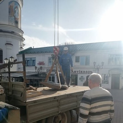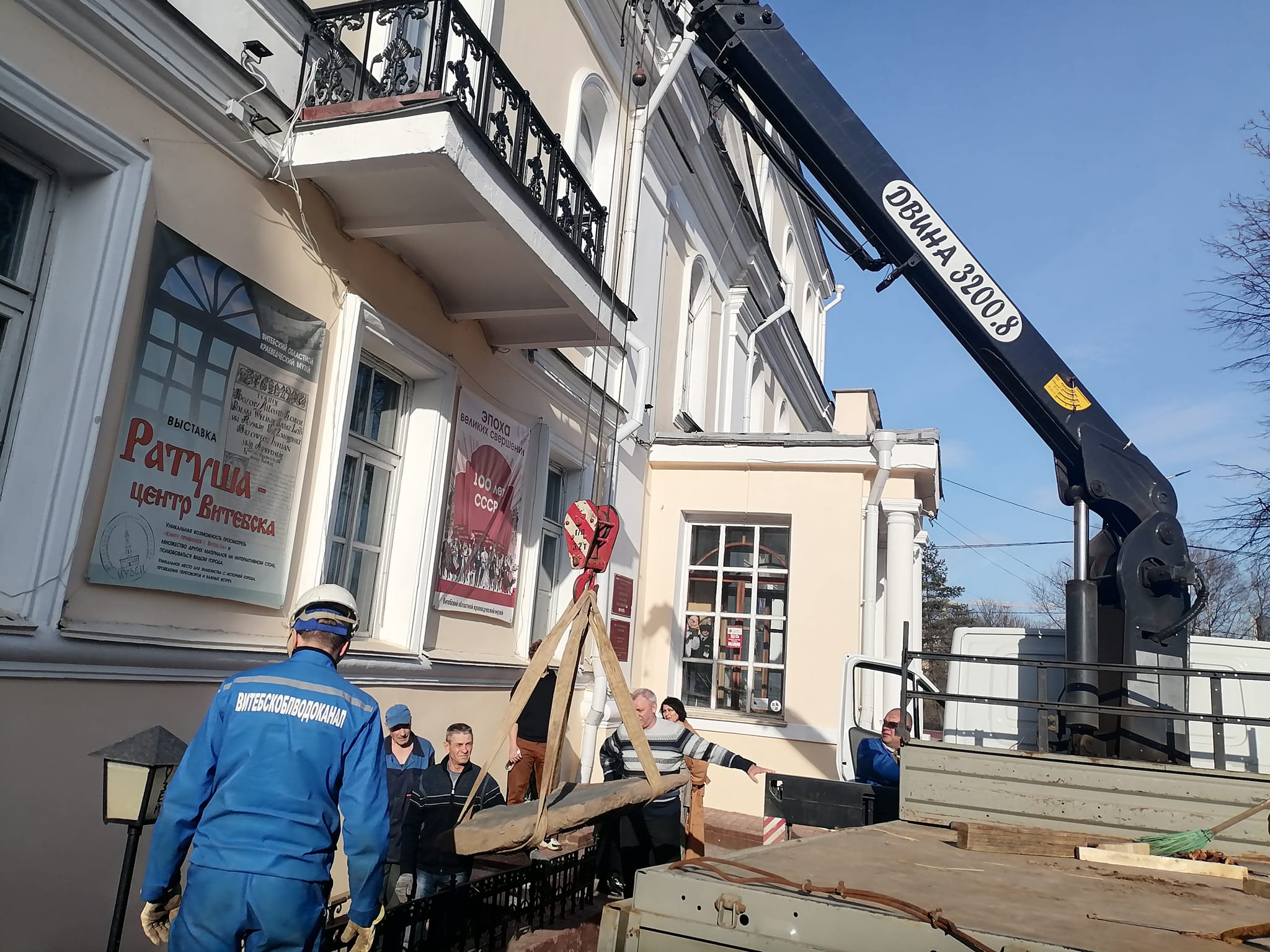 Уже на следующий день, 31 марта, крест доставили в Витебский областной краеведческий музей. Из-за внушительных размеров и веса каменной глыбы для погрузки и разгрузки пришлось задействовать подъемный кран.