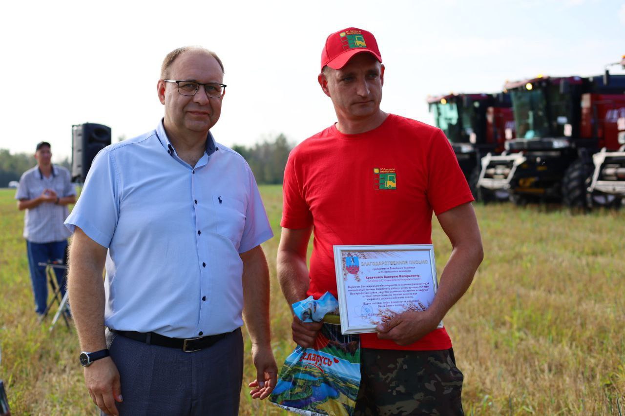 Особую благодарность комбайнерам из соседней области выразил председатель Витебского райисполкома Сергей Егоров. В поле у деревни Ильичёвка им вручили благодарственные письма и ценные подарки. Провожали аграриев Могилёвщины домой с песней.