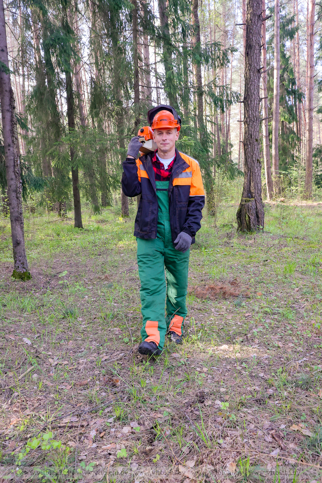 — Мне нравится трудиться в лесу, ежедневно видеть сезонные перемены природы, — делится Вадим Клячковский. — Иногда возле делянки вижу лесных жителей — медведей, лосей, косуль, кабанов, один раз даже встретился с рысью. Работать летом намного проще. Зимой нужно пробираться по высокому снегу на участок, расчищать себе дорогу, обрезать заснеженные сучья поваленного дерева. Валка леса проходит при любой температуре, но запрещается при ветре больше 11 метров в секунду, видимости менее 50 метров, грозе, дожде и прочих неблагоприятных погодных условиях.