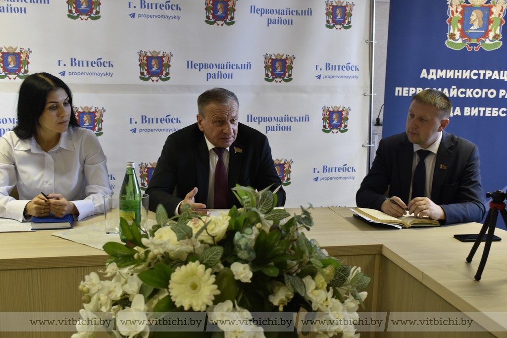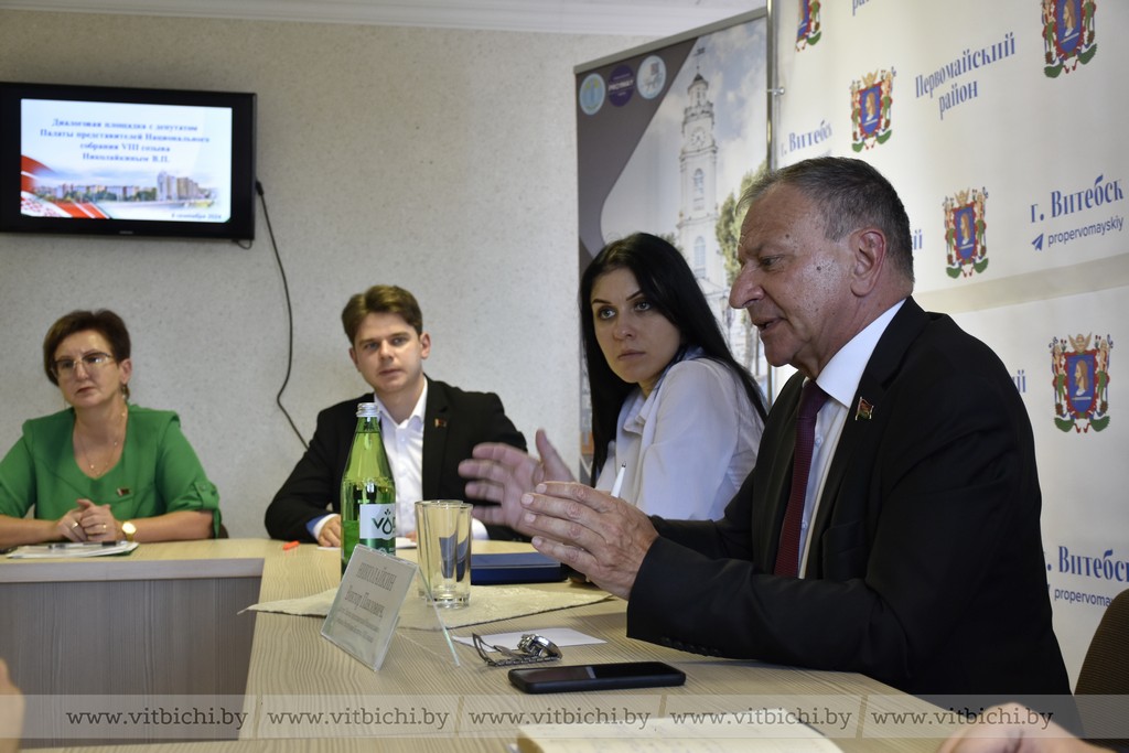 6 сентября / "Витьбичи" / Виталий Сеньков/. Депутат Палаты представителей Национального собрания Республики Беларусь, председатель Постоянной комиссии по экономической политике Виктор Николайкин вместе с руководителями учреждений общего среднего образования Первомайского района принял участие в диалоговой площадке «От качества образования – к качеству жизни».