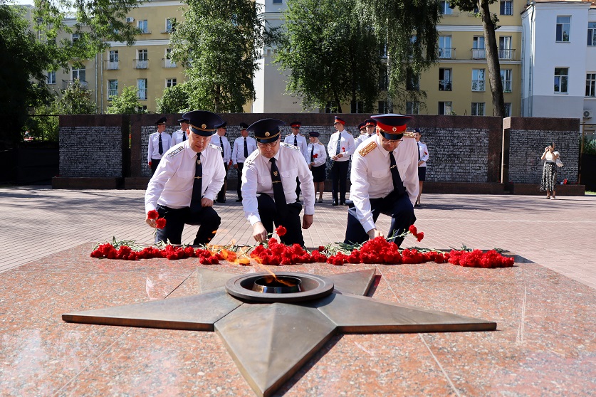 Встреча коллег продолжилась в сквере Памяти Героев, где офицеры двух государств возложили цветы к Вечному огню и почтили память погибших в годы Великой Отечественной войны минутой молчания. В памятном месте генерал-майор юстиции Александр Гуцко также вручил награды Председателя Следственного комитета Беларуси российским следователям. Среди наград: медаль Следственного комитета Республики Беларусь «За ỳзаемадзеянне» и памятный нагрудный знак «10 год Следчаму камiтэту Рэспублiкi Беларусь».