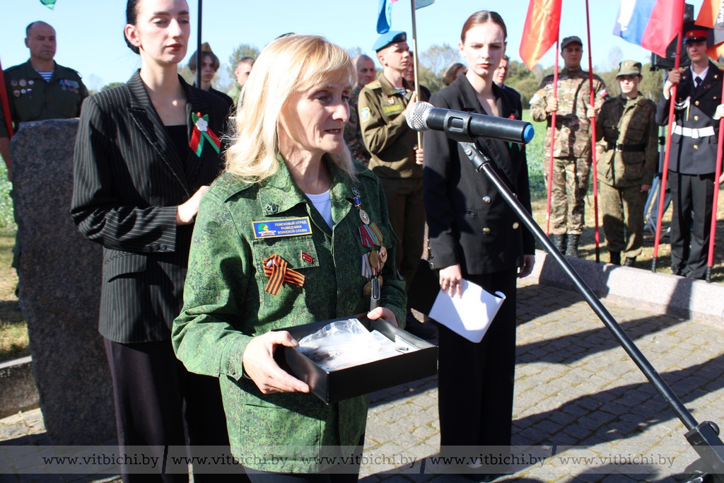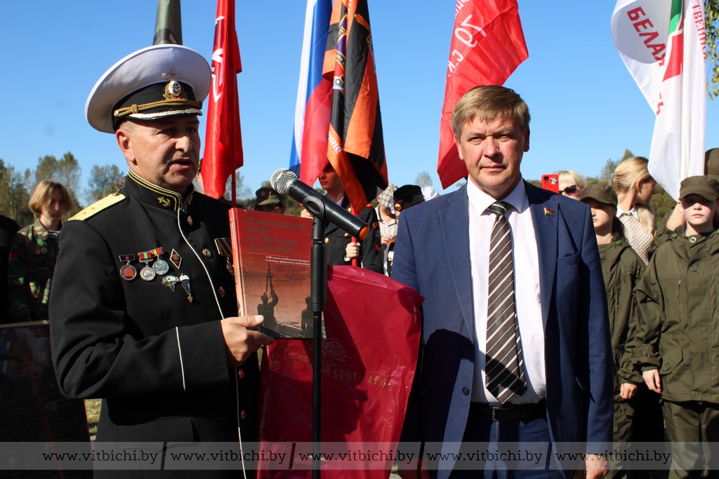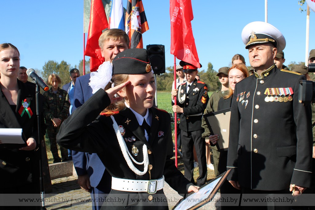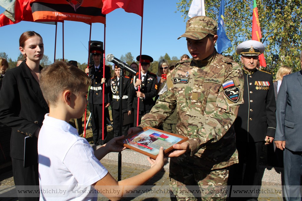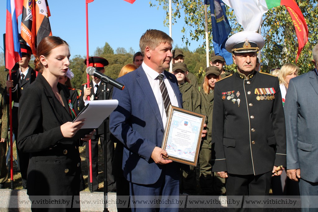 Председатель Витебского районного Совета депутатов Виктор Дорожкин вручил благодарственные письма за сотрудничество в увековечивании памяти защитников Отечества, погибших в годы войны, коллективу Витебского кадетского училища, кадетам и юнармейцам школы № 1374 города Москвы и командиру 52-го отдельного специализированного батальона подполковнику Андрею Рубину.