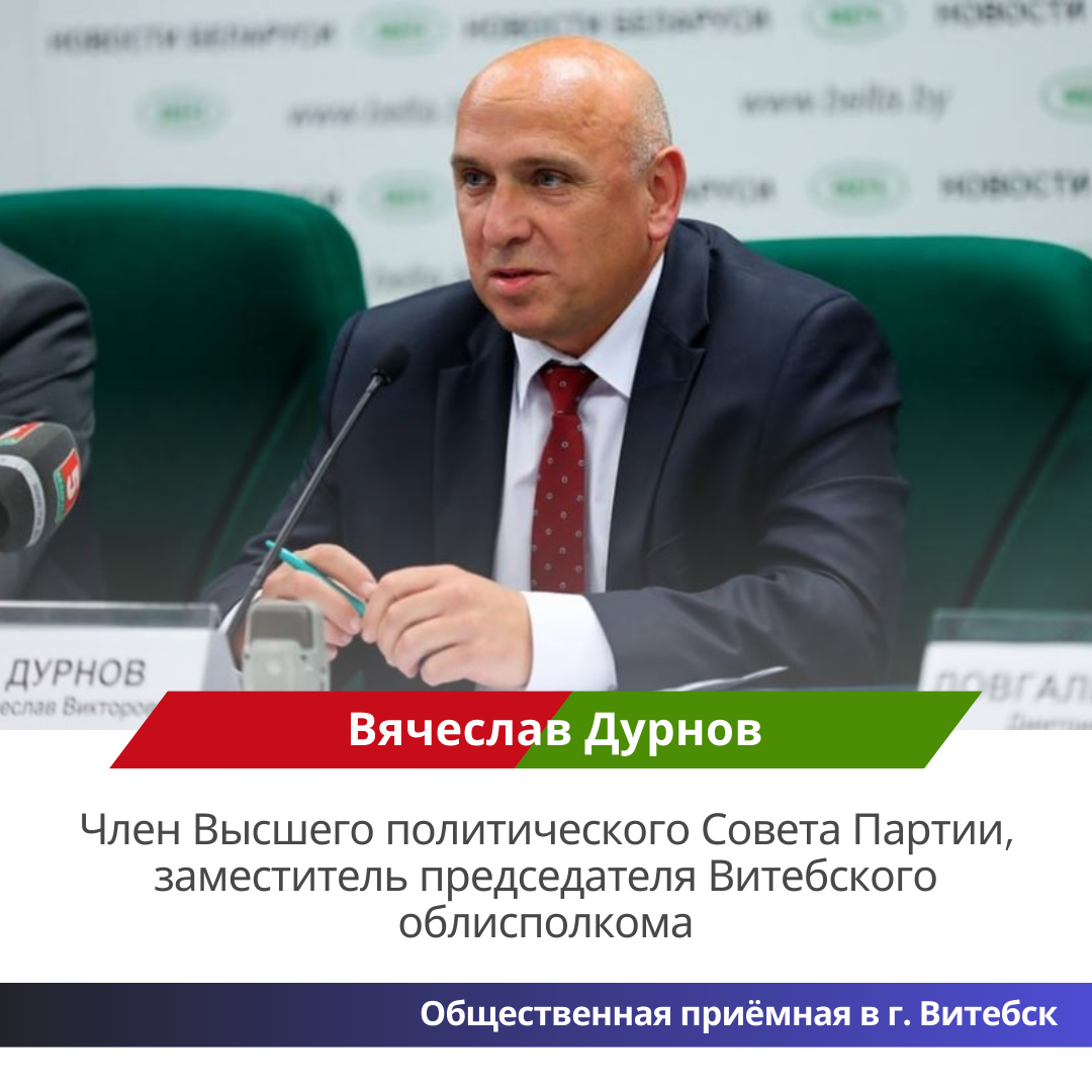 Вячеслав Викторович Дурнов, член Высшего политического совета Партии, заместитель председателя Витебского облисполкома проведет приём граждан с 11.00 до 13.00 по адресу: г.Витебск, ул. Правды, 18, каб. 62 (административное здание облисполкома).