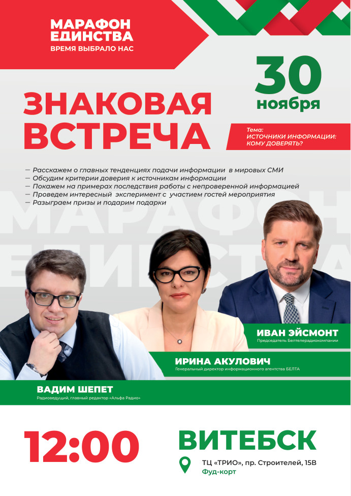 "Знаковая встреча" пройдет 30 ноября в Витебске во время республиканской общественно-культурной акции "Марафон единства". Местом встречи станет один из крупных торговых центров.