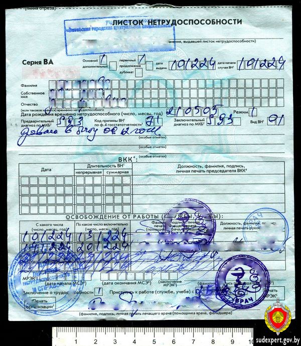 — При исследовании бланка выяснилось, что участки бумаги в графе «Приступить к работе…» подвергались воздействию влаги. В рукописной записи, которая отражала дату выхода на работу, были сделаны изменения: новая запись была дорисована поверх первоначальной. В результате дата изменилась с «21.12.24» на «24.12.24», — рассказала официальный представитель управления ГКСЭ по Витебской области Наталья Романова. — Витебчанка также дописала даты, фамилию врача и его подпись в строке «ОСВОБОЖДЕНИЕ ОТ РАБОТЫ…».
