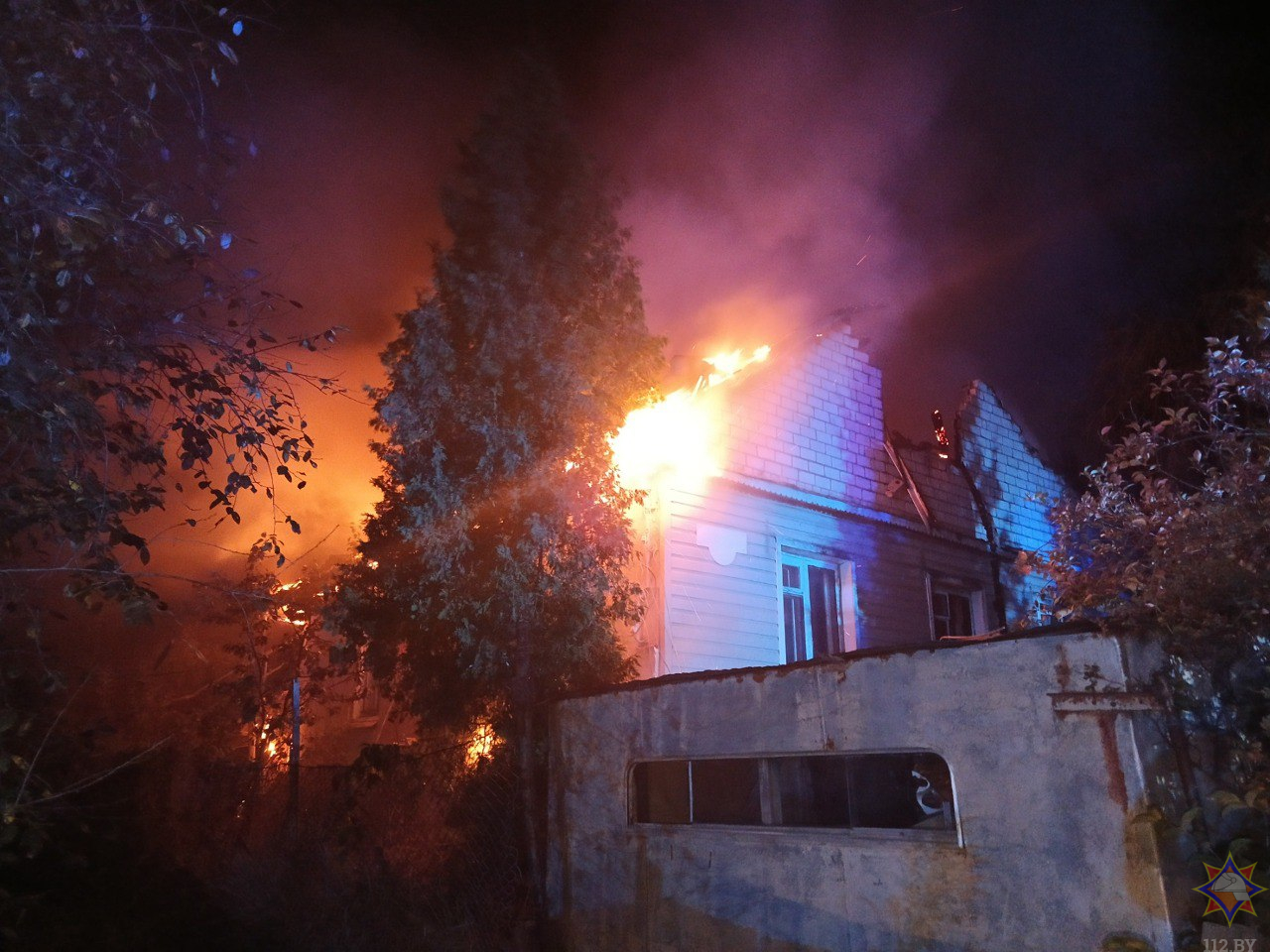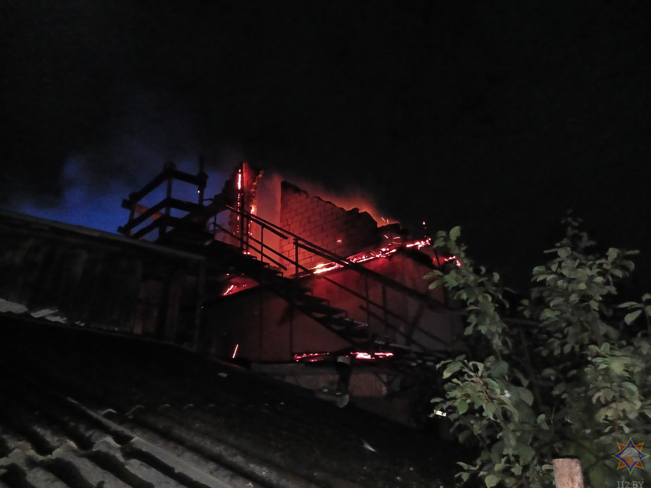 По прибытии спасателей к месту вызова наблюдалось открытое горение дома с обрушением кровли, загорание хозяйственной постройки и гаража.