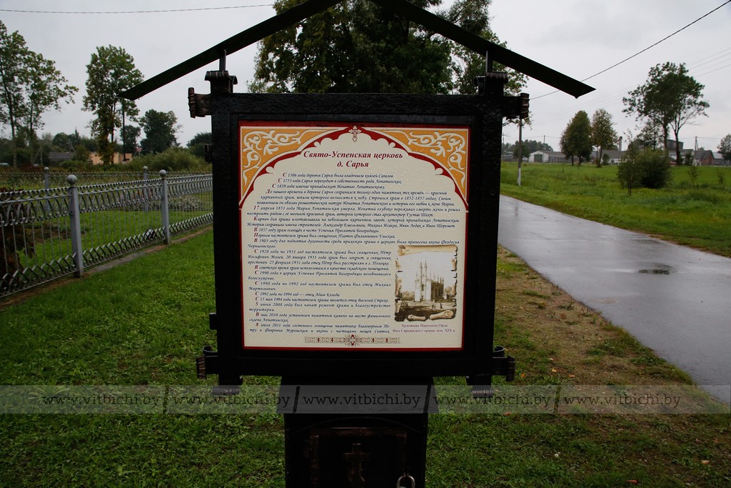 Первые упоминания о Сарье относятся к 1508 году. Здешние земли изначально принадлежали древнему роду Сапегов. К Лопатинским же, с которыми связана история церкви, поместье перешло в XVIII веке. Идея возведения святыни появилась у шляхтича католического вероисповедания Игнатия Лопатинского после смерти его супруги, которая была православной. Летом 1851 года был заложен фундамент. На возведение стен понадобилось несколько лет.