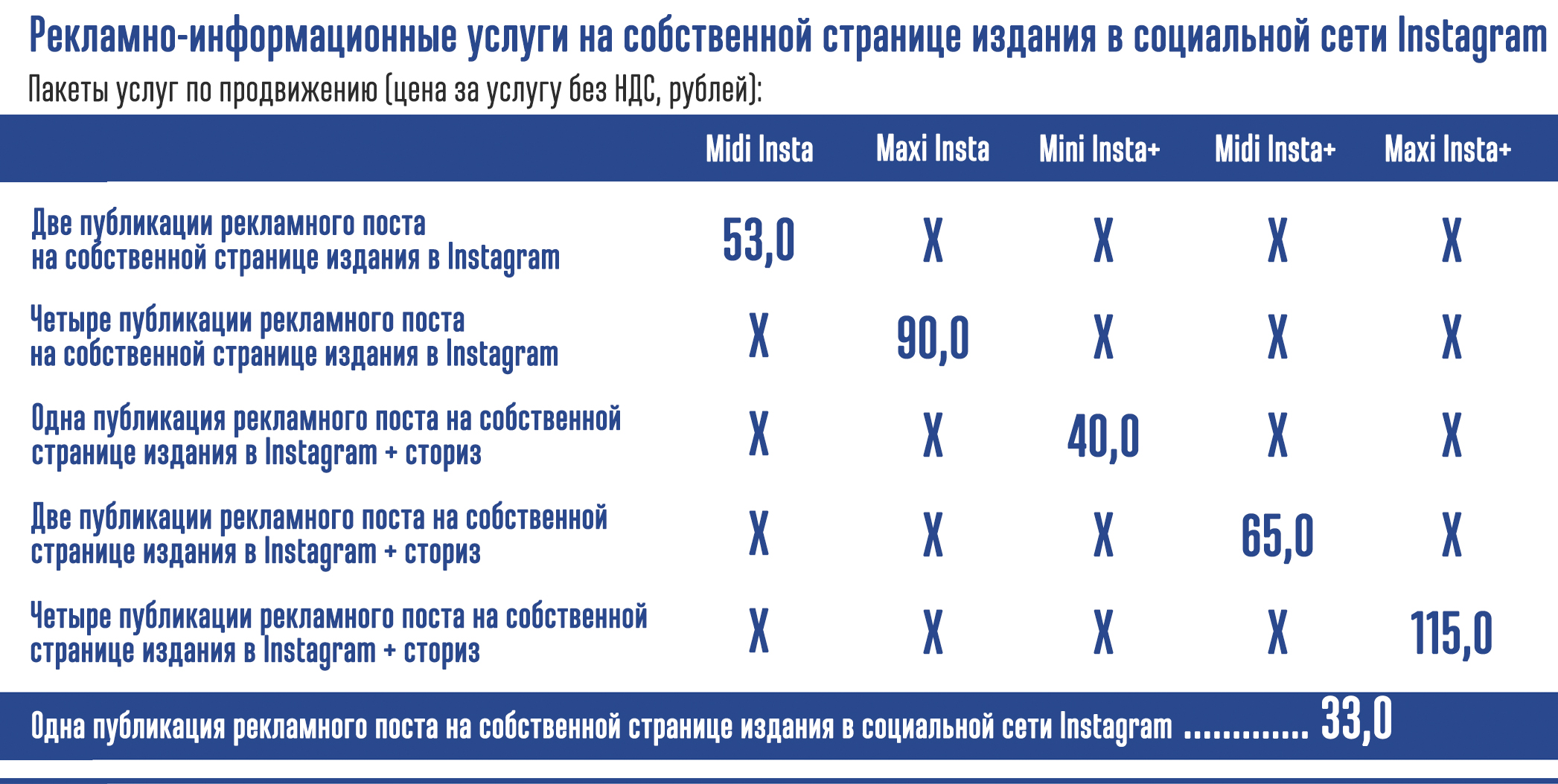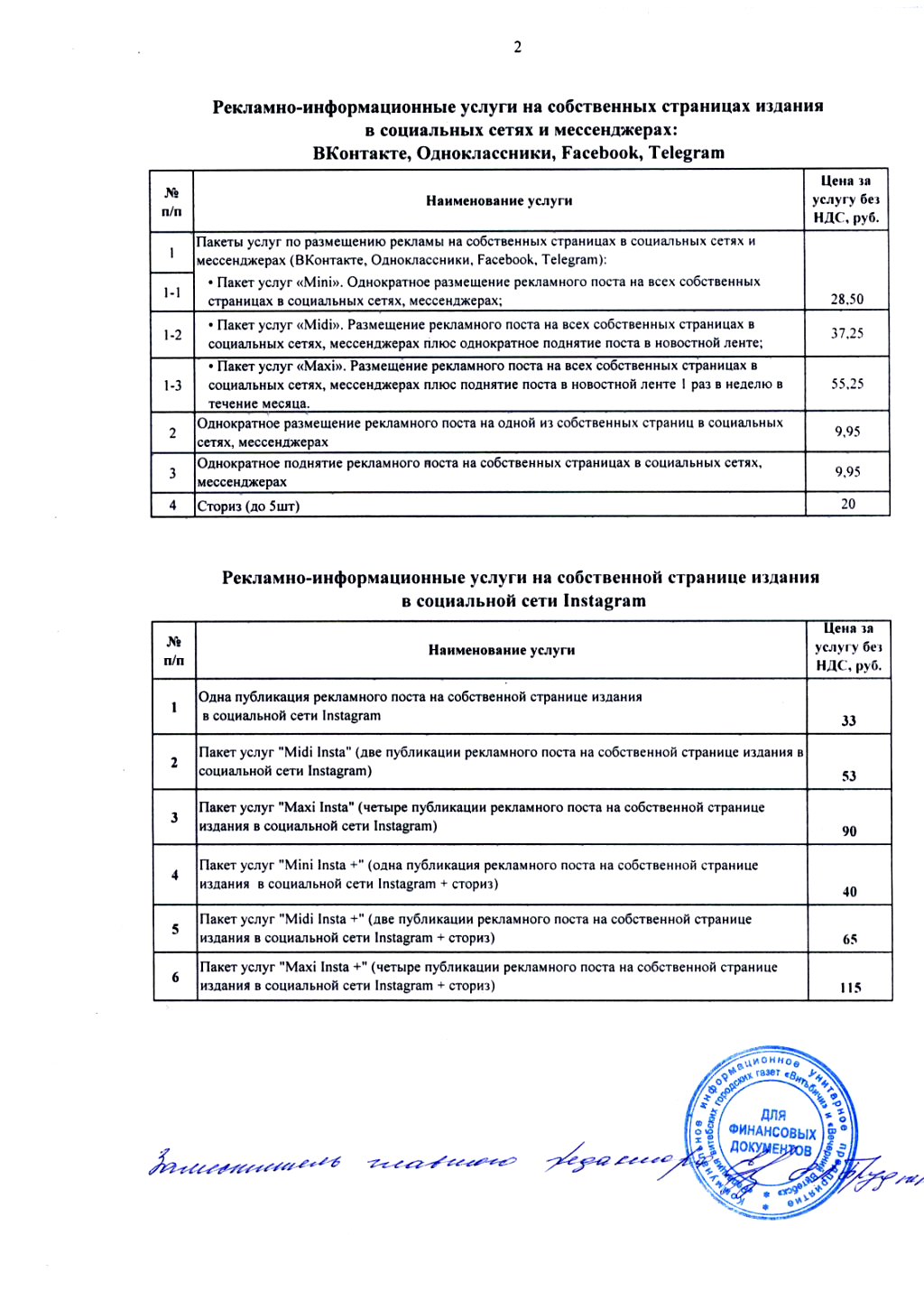 Прейскурант на размещение рекламно-информационных материалов в соцсетях.
