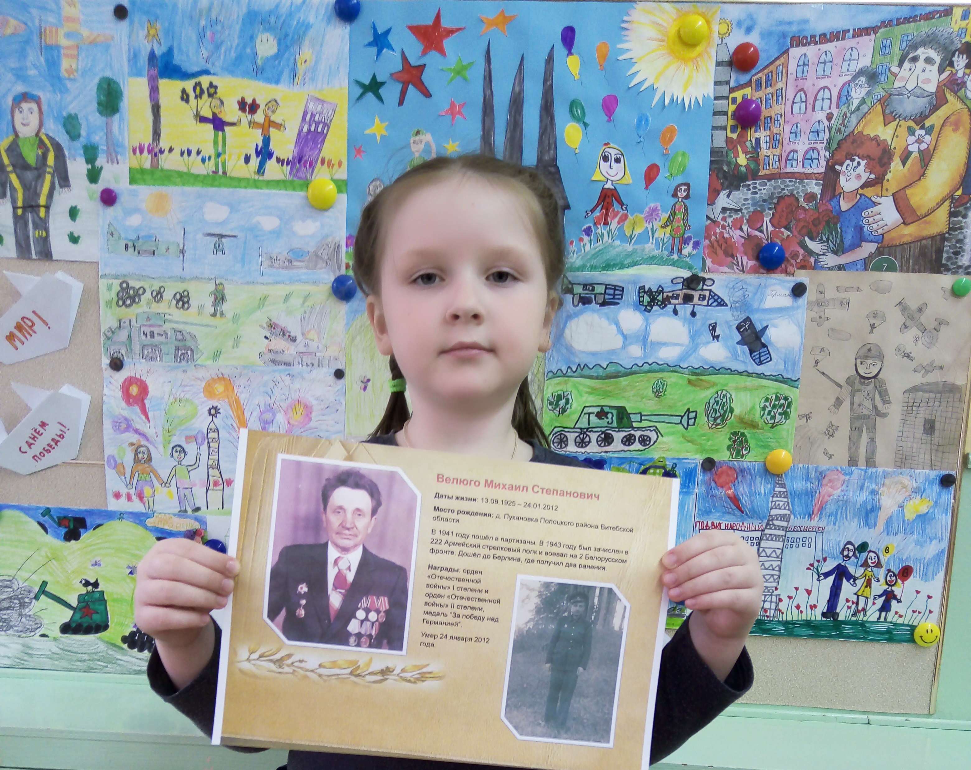 И детей нужно воспитывать в памяти об этом. Мы в детском саду №101 стараемся поступать именно так. Поэтому в преддверии 75-летия Великой Победы вспоминаем всех, кто своим ратным трудом приближал этот день. Нет в нашей стране семьи, не взрастившей героя, принявшего участие в борьбе за её будущее. Поэтому наши воспитанники и сотрудники поделились сведениями о своих близких, прошедших ад войны. Ребята рассказали о героических прадедушках и прабабушках, даже представили себя на их месте и изобразили это в рисунках, коллажах, аппликациях. Научились складывать «военные треугольники» со словами благодарности и признательности. Стая бумажных «голубей мира», сделанных детскими ручками, ждёт момента покинуть стены детского сада. Стихи о войне и Победе, которые разучивают ребята, прозвучат во время конкурса чтецов ближе к знаменательной дате. А все собранные материалы легли в основу мемориального альбома «Мы помним, мы гордимся». В нём упоминаются имена почти 60 героев войны. В альбом вошли также воспоминания ветеранов, их близких и однополчан. А также фотографии и документы из личных архивов.