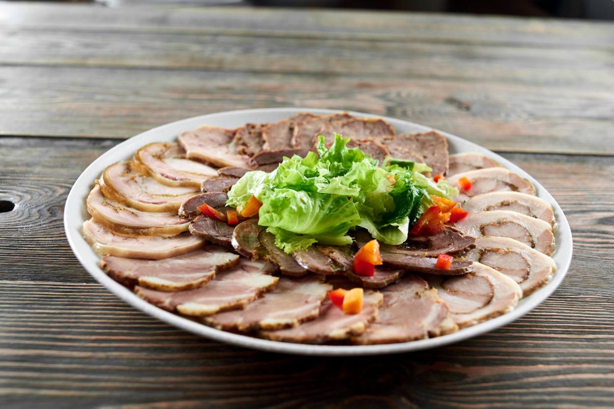 Ингредиенты: 2 свиных языка, 4 зубчика чеснока, 1 чайная ложка хмели-сунели, 1 чайная ложка сушеного тимьяна, 2 столовые ложки соевого соуса, 2 столовые ложки растительного масла, пекинская капуста, помидоры черри, свежемолотый черный перец.