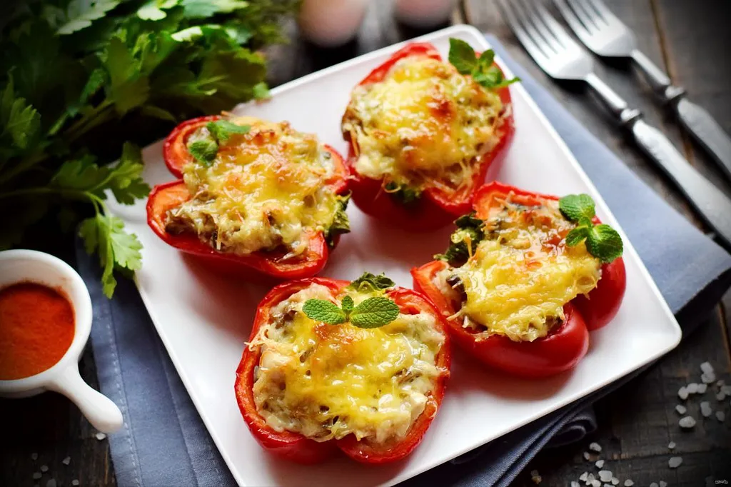 Заготовки переложите в форму для запекания, сверху выложите измельченный твердый сыр. Форму поместите в разогретую духовку, запекайте при температуре 200 градусов 15–20 минут. Духовку выключите, блюдо оставьте внутри еще на 15 минут, чтобы сам перец стал мягче. Жюльен в перцах украсьте свежей зеленью.