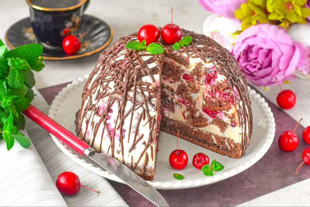 Разрежьте шоколадный корж на две части. Нижнюю — отложите, а верхнюю и ванильный бисквит разрежьте на кубики. Выложите шоколадный корж на тарелку. Сверху равномерно распределите три столовые ложки крема. Посыпьте орехами. Бросьте в миску с кремом вперемешку 7–8 бисквитных кубиков. Хорошенько их обмакните в креме и выложите на нижний корж с кремом. Посыпьте орехами и вишней. Продолжайте, чередуя слои и придавая торту форму стога, пока не закончатся ингредиенты.