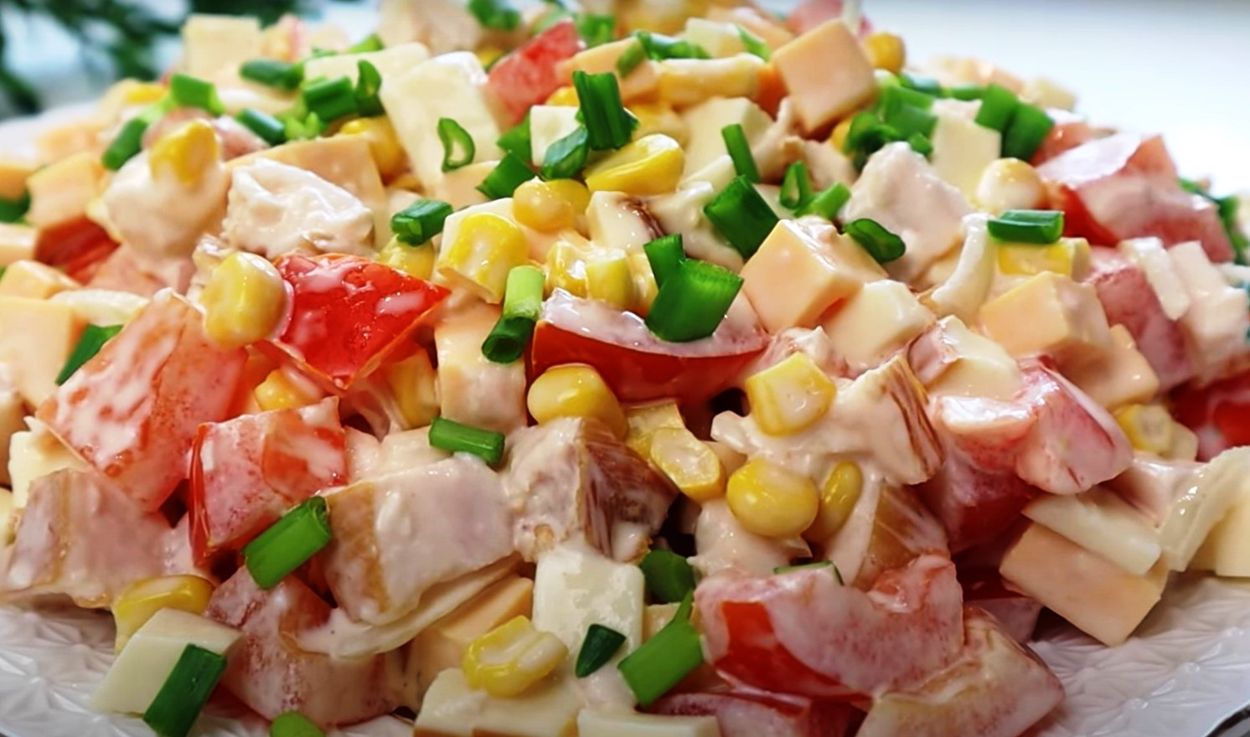 Приготовить это простое блюдо можно не только к приходу гостей, но и для повседневного меню. Салат сытный и очень вкусный. Ветчину можно по желанию заменить на колбасу, причем подойдет как вареная, так и копченая.