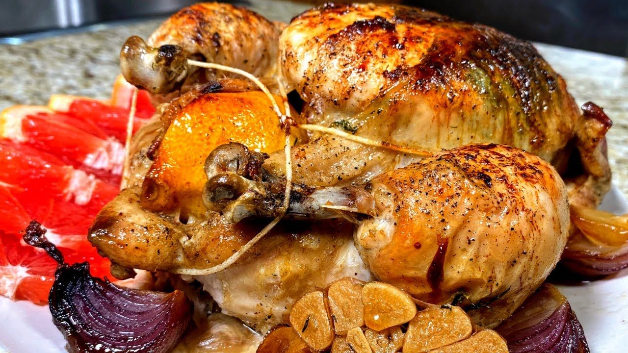 Ингредиенты: курица – весом 2 килограмма, чеснок – 3-4 головки, соль – 1 чайная ложка, специи для курицы – 1-2 чайные ложки, перец душистый молотый – 0,5 чайной ложки.