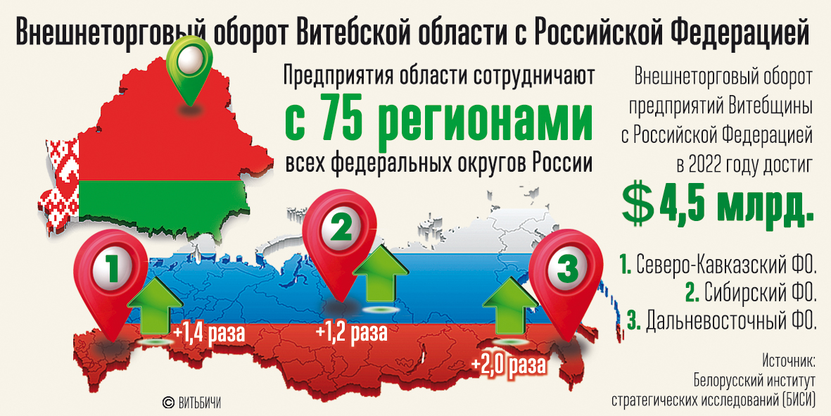 Внешнеторговый оборот предприятий Витебщины с Российской Федерацией в 2022 году достиг рекордной за последние 5 лет величины, преодолев уровень в 4,5 миллиарда долларов. Предприятия области сотрудничают с партнерами из 75 регионов всех федеральных округов России.