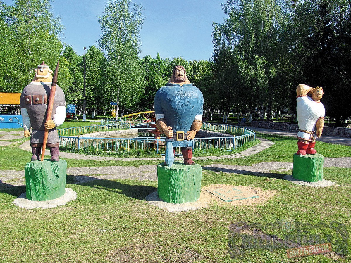 Кажуць, дзяцей трэба выхоўваць на станоўчых прыкладах, на добрых учынках. Зыходзячы з гэтага пункту погляду, муляр участка дрэваапрацоўкі Шумілінскай жыллёва-камунальнай гаспадаркі Аляксандр Сіпко вырабіў з дрэва трох асілкаў — Ілью Мурамца, Алёшу Паповіча і Дабрыню Мікіціча, як расказаў начальнік участка Сяргей Бандарэнка. Ну а ўстанаўлівалі малыя архітэктурныя формы ў гарадскім парку ў Шуміліне ўсёй дрэваапрацоўчай брыгадай. Тры асілкі прыгожыя і моцныя, у казках яны заўсёды абараняюць слабейшага. І дабро абавязкова перамагае зло. Няхай так будзе і ў жыцці.
