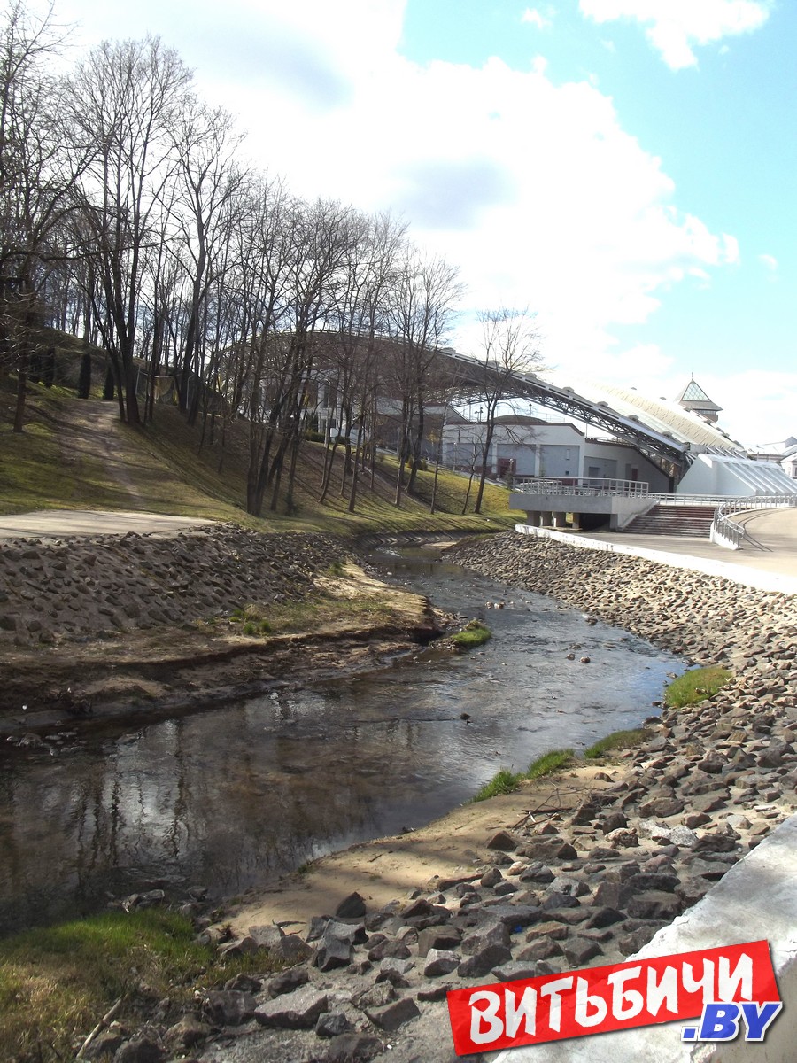 Свой шлях мы пачалі ад Летняга амфітэатра. Тут нядаўна было праведзена добраўпарадкаванне. Берагі выкладзены каменнем, ёсць альтанка і нават арэлі. Што ж, скарыстаўшы момант, прысядзем на дарожку, бо перад намі стромкі абрыў, трэба ўзыходзіць наверх.