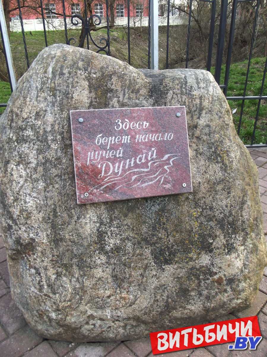 А некалькі гадоў таму ў нашым горадзе нават з'явіўся памятны знак у гонар Дуная. Пры рэканструкцыі плошчы перад УУС і 103-й Віцебскай асобнай гвардзейскай паветрана-дэсантнай брыгадай будаўнічая кампанія «ПлиссаСтрой» усталявала сімвалічны камень. Адпаведная шыльда паведамляе, што тут знаходзіцца выток ручая Дунай, а значыць, наша вандроўка падышла да свайго завяршэння.