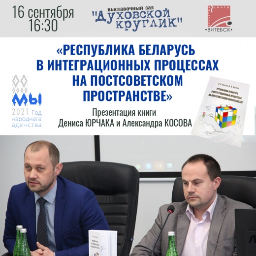 В рамках мероприятий, проходящих в преддверии Дня народного единства, в выставочном зале «Духовской круглик» 16 сентября в 16.30 состоится презентация монографии Александра Косова и Дениса Юрчака «Республика Беларусь в интеграционных процессах на постсоветском пространстве».
