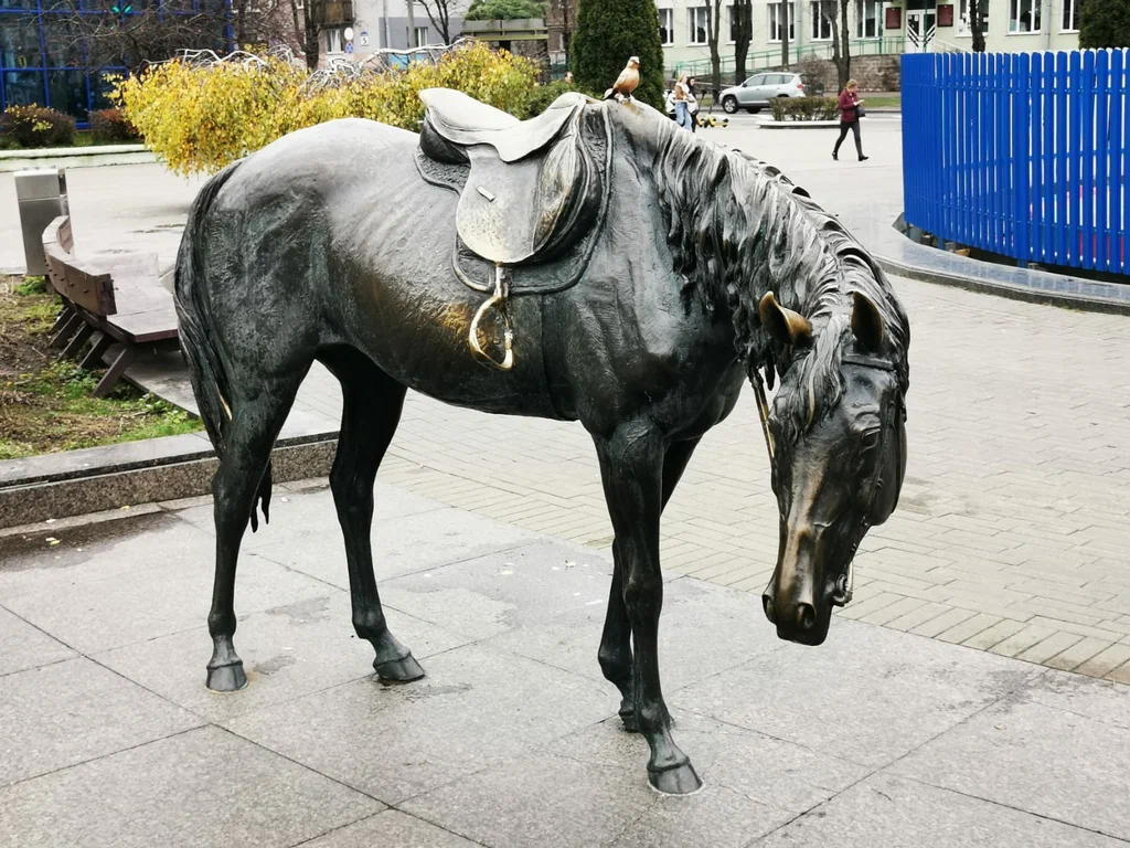Оседлать лошадь в Минске можно и на площади у Комаровского рынка. Там находится скульптура «Лошадь и воробей».