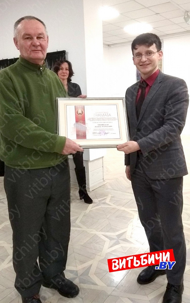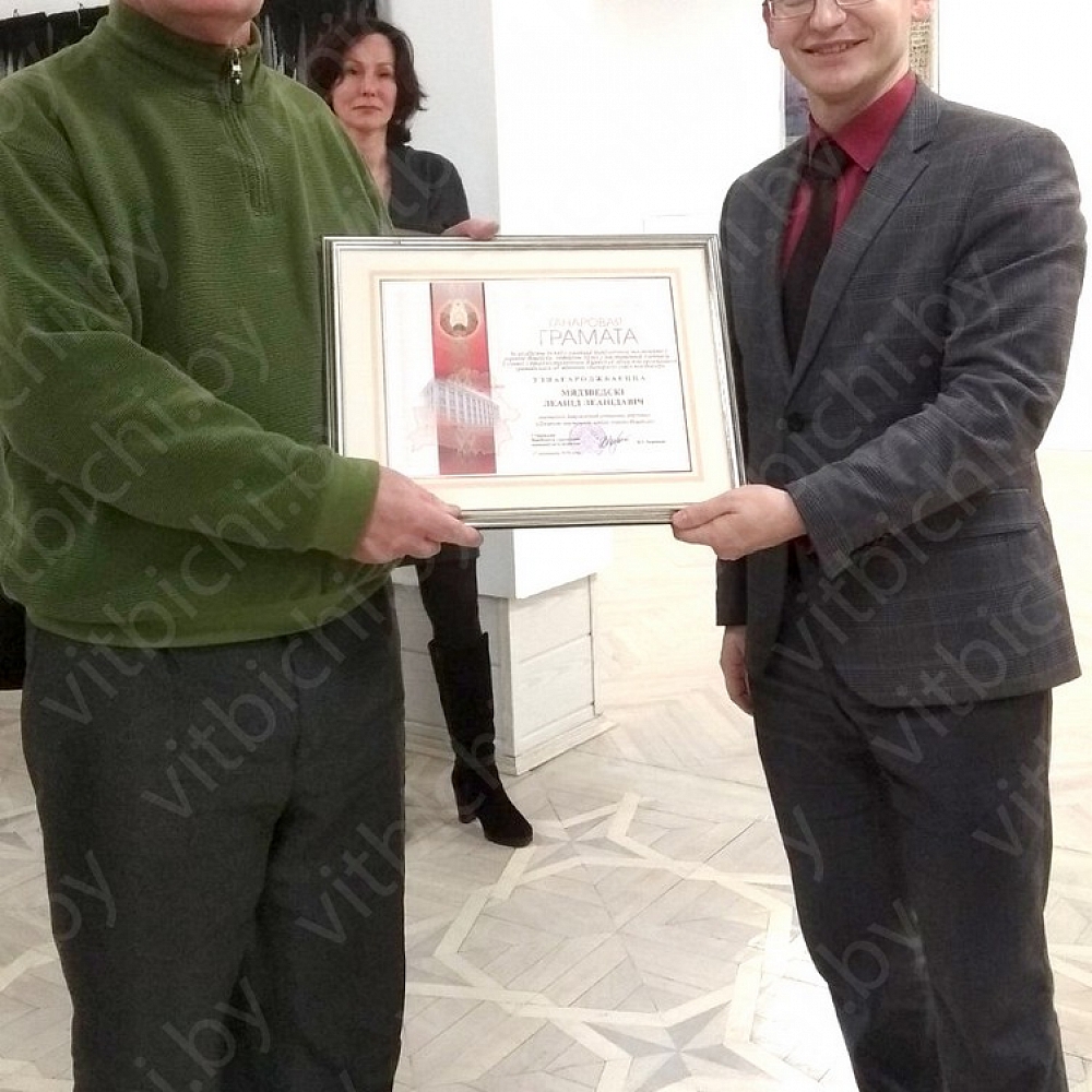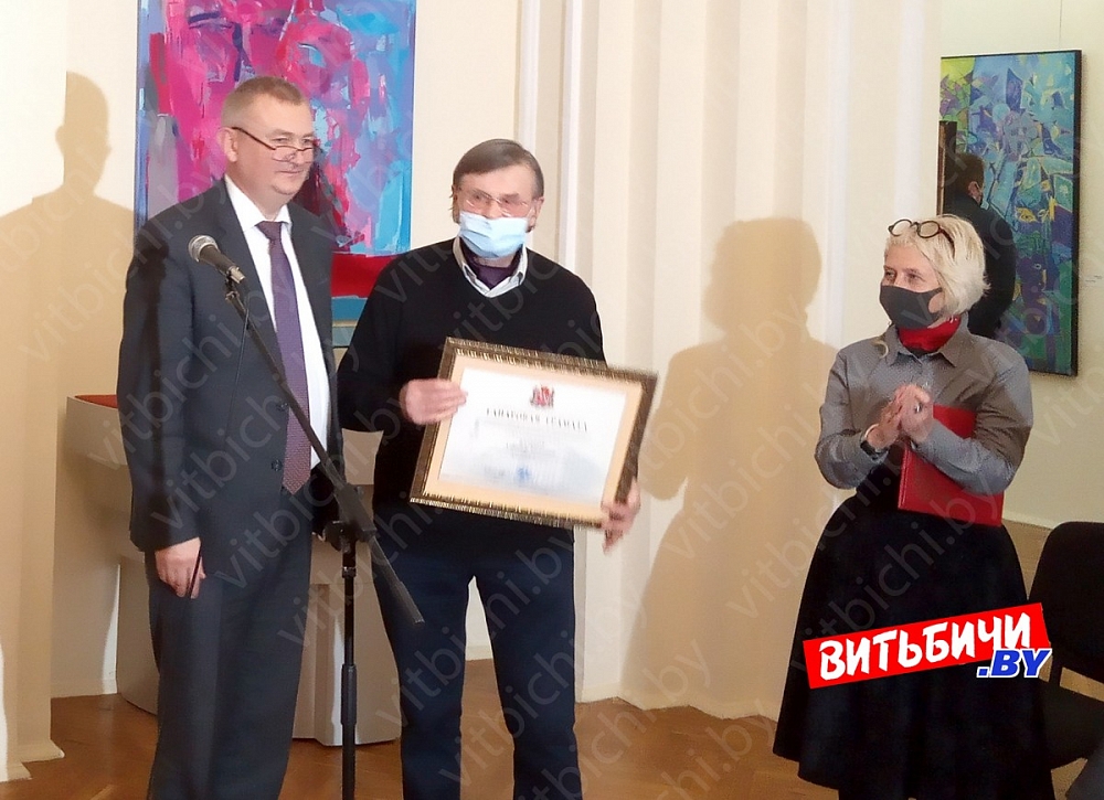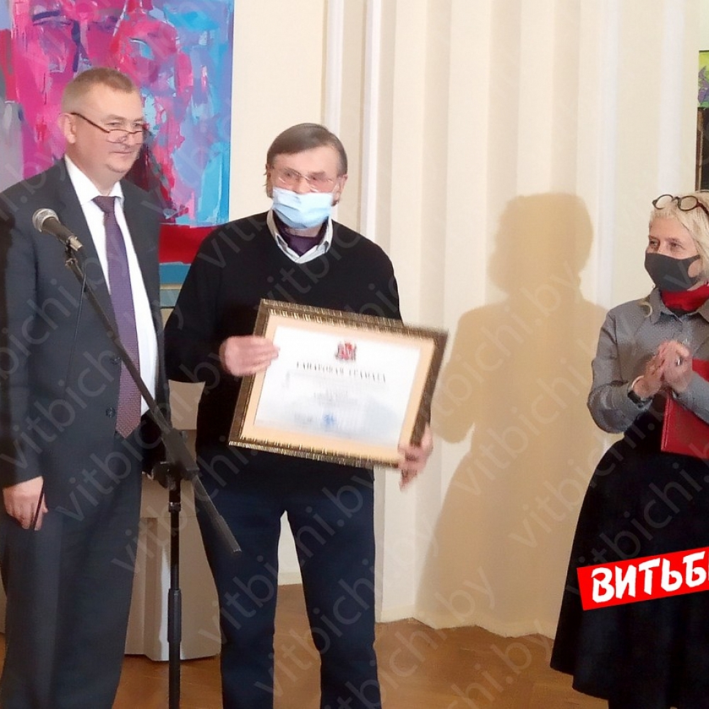В тот же день в выставочном зале Центра современного искусства художников поздравили заместитель председателя горисполкома Виктор Глушин и начальник отдела культуры горисполкома Наталья Шиенок. Почетными грамотами горисполкома были награждены члены Белорусского союза художников Александр Слепов, Андрей Жигур, Леонид Медведский, Виктор Медвецкий, Александр Лисов.