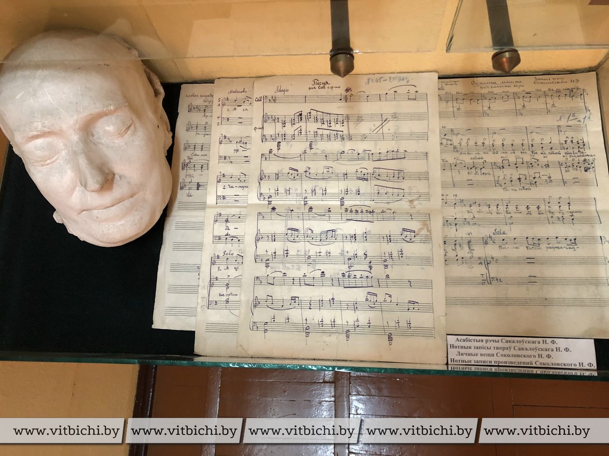 – Многие вещи композитора, 120-летие со дня рождения которого мы будем отмечать 9 ноября этого года, нам передала еще в феврале 1970-го его жена Ольга Игнатьевна Соколовская, – рассказывает директор музея Ольга Талярёнок. – Это была ее инициатива. В экспозиции – посмертная маска Нестора Федоровича, брошюры «Хлопец кудравы. Раманс», «А ў полі ды крынічанька. Беларуская народная песня», «Тры песні», «Выбраныя вакальныя творы», «Чырвоная вяргінечка» – все с дарственной надписью Ольги Игнатьевны, «Дзяржаўны гімн Беларускай ССР», нотные записи, членский профсоюзный билет Нестора Соколовского и уникальный документ – автобиография.