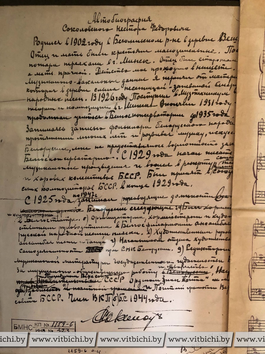 На этом листке – короткое описание жизненного пути. Вот как он начинался: «Родился в 1902 году в Бегомльском районе в деревне Вешки. Отец и мать были крестьяне малоземельные. После пожара переехали в Минск. Отец был сторожем, дворником, а мать прачкой. Детство мое проходило в нищете. Музыкально-вокальные данные я перенял от матери, которая в деревне слыла песенницей-запевалой белорусских народных песен. В 1926 году поступил в музтехникум по классу теории и композиции…продолжил образование в Белгосконсерватории…».
