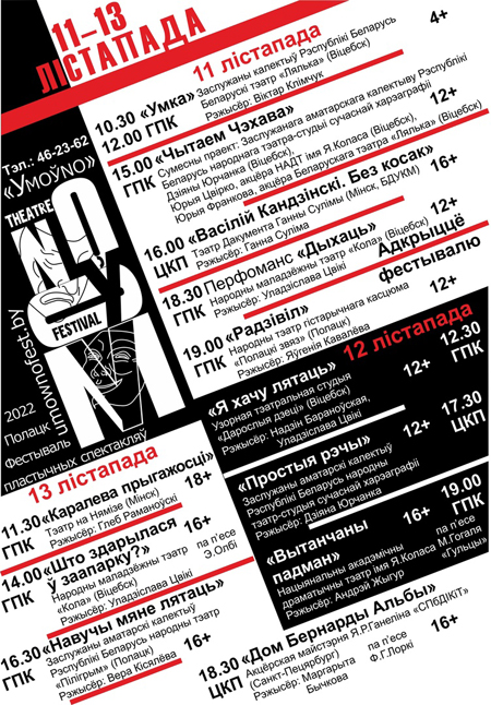 Тэатральны фестываль «Умоўno» пройдзе ў Полацку з 11 па 13 лістапада. Гэты адносна малады праект развіваецца з 2019 года, праграма яго была разнастайнай, але мэта застаецца нязменнай – абмен вопытам у творчых эксперыментах і накірунках на шляху да тэатра будучыні.