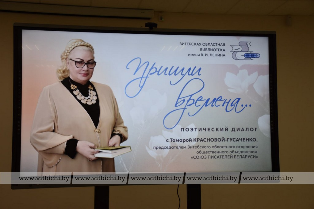 7 апреля / «Витьбичи» / Виталий Сеньков /. В Витебской областной библиотеке имени В. И. Ленина состоялась поэтическая встреча «Пришли времена», посвященная Году белорусских женщин, с поэтессой, прозаиком, публицистом, общественным деятелем Тамарой Красновой-Гусаченко.