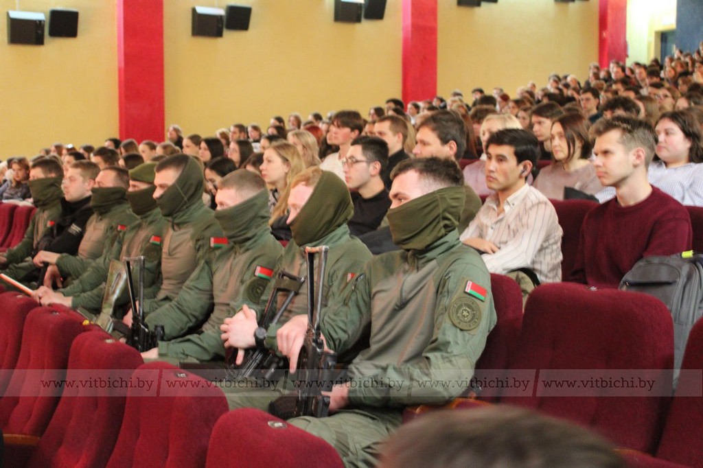 Затем к зрителям обратился заместитель военного комиссара Витебской области полковник Игорь Лазовский. Неспокойно за пределами Беларуси, сказал он. Идут боевые действия за нашими южными рубежами. И неслучаен слоган фильма: «Сохранение мира в условиях войны – наш общий долг!».
