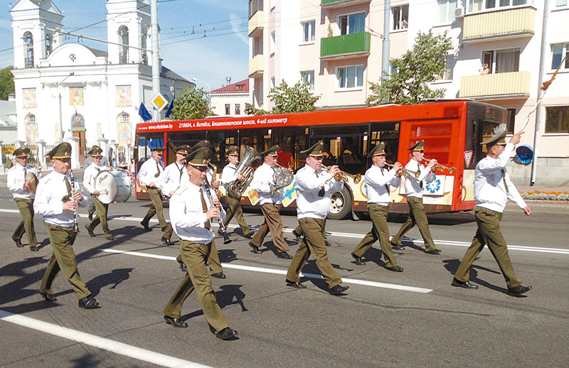 В рамках фестиваля «Славянский базар в Витебске» прошел смотр-конкурс военных оркестров Вооруженных Сил Республики Беларусь и транспортных войск. 15 коллективов, представлявших войсковые части нашей страны, прошли парадом от площади Ленина до площади Победы, где и провели зажигательный плац-концерт.
