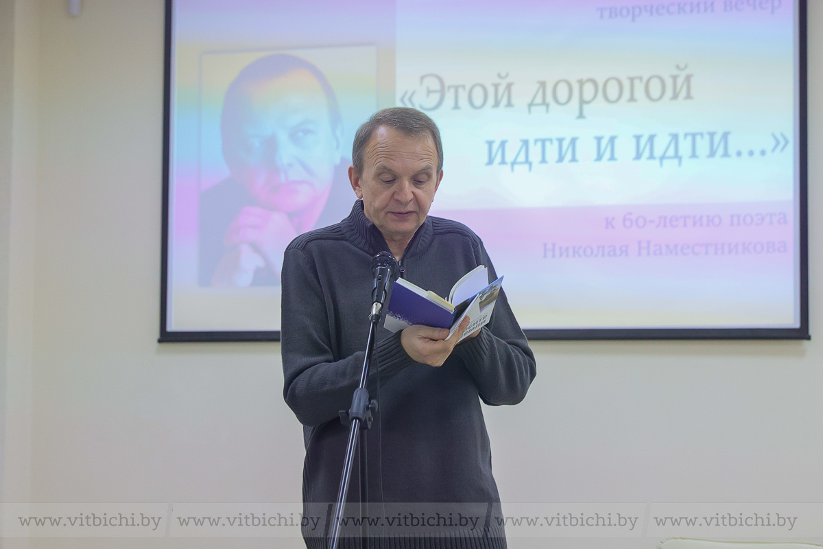 Поэтическая строка «Этой дорогой идти и идти…», ставшая девизом праздновавшего 60-летний юбилей Николая Наместникова, словно бы послужила ответом на все вопросы к поэту, связанные с творческими планами. Николай Наместников – член Союза писателей Беларуси, в котором он состоит 17 лет, обладатель нагрудного знака СПБ «За большой вклад в литературу», лауреат областной литературной премии имени Петруся Бровки, выпустил несколько сборников стихов.