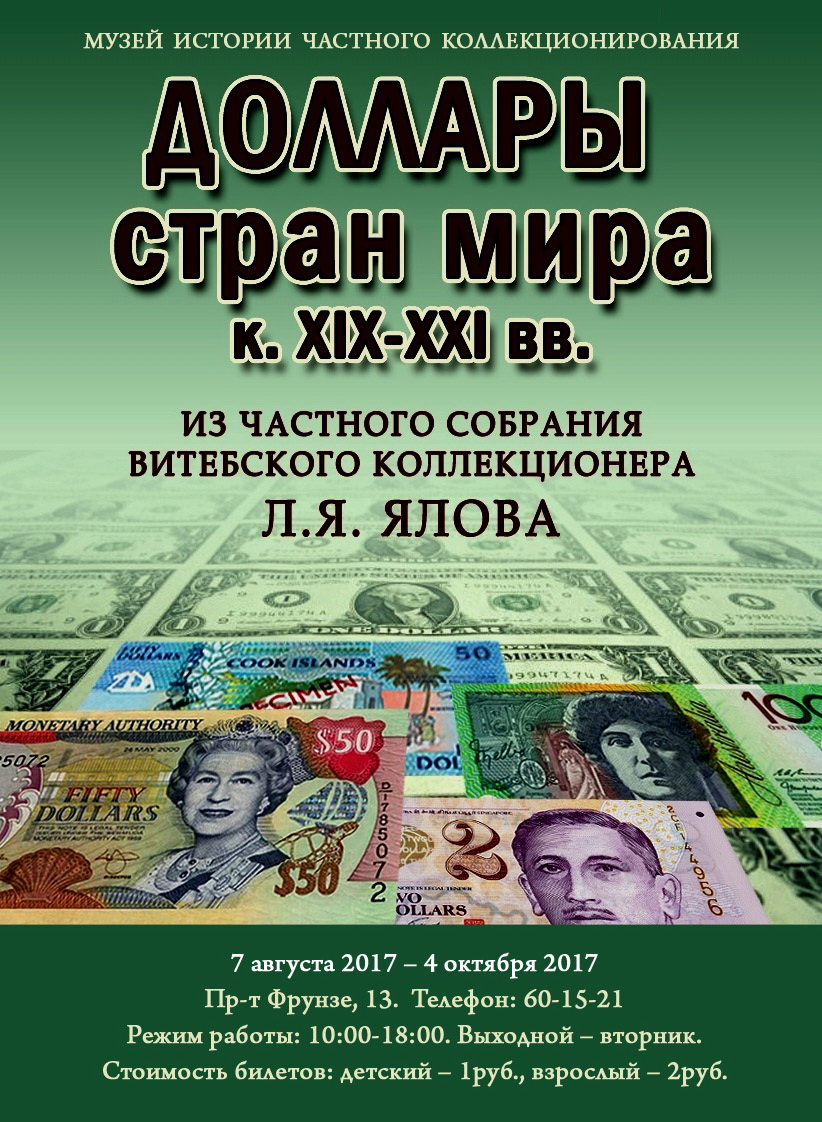 Доллары бывают не только зелеными и не только с портретами американских президентов… Выставка «Доллары стран мира XIX-XX веков» из собрания витебского коллекционера Леонида Ялова, который посвятил своей коллекции более 20 лет, расширит познания об этой валюте. Ее используют сейчас в 26 странах мира.