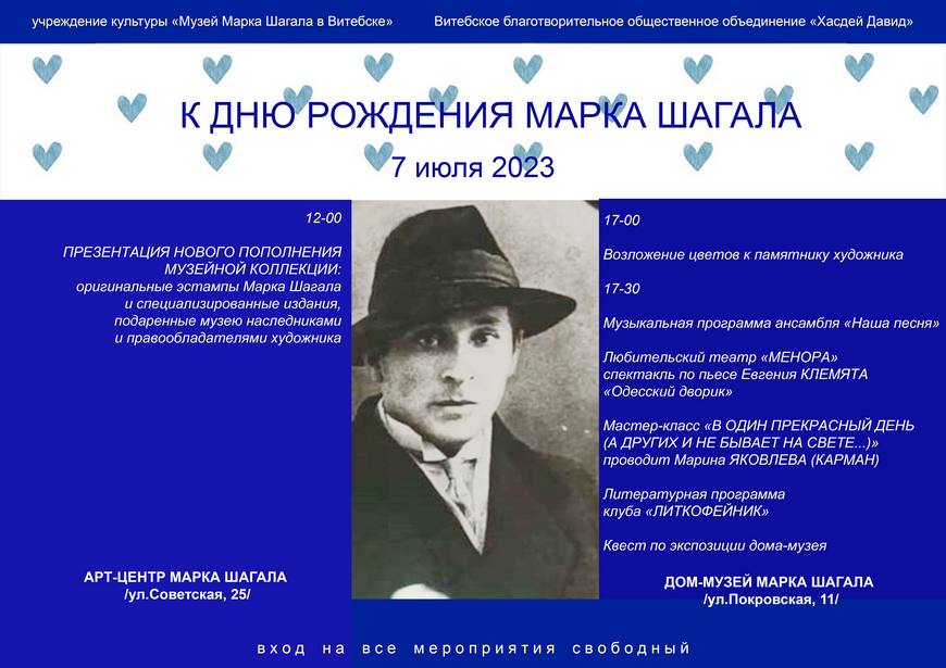 В 17.00 горожане и гости Витебска смогут возложить цветы к памятнику Марку Шагалу, расположенному в начале улицы Покровской, чтобы почтить память художника. А затем в саду дома-музея начнется программа, подготовленная Музеем Марка Шагала совместно с Витебским благотворительным общественным объединением «Хасдей Давид» и народным литературным клубом клубом «ЛитКофейник». Прозвучат стихи о художнике и Витебске, музыкальные номера в исполнении вокального ансамбля «Наша песня», любительский театр «Менора» покажет спектакль «Одесский дворик», творческий мастер-класс проведет Марина Яковлева (Карман), желающие смогут пройти квест по экспозиции дома-музея. Вход в сад свободный.