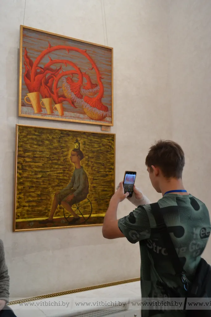 В центральном фойе концертного зала «Витебск» состоялась презентация выставки живописи представителей витебского творческого объединения «M’Art». В центральном фойе необычный перформанс представили артисты молодёжного театра «Колесо».
