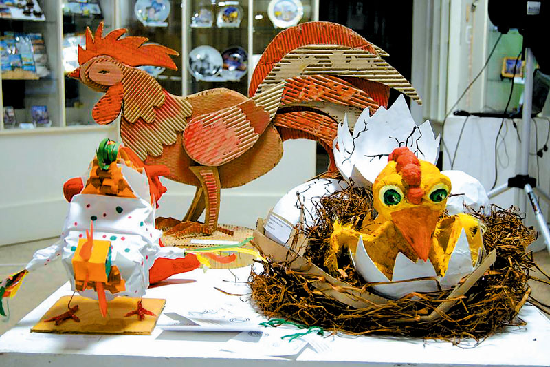 При подготовке работ учащиеся вольны были выбирать любую технику исполнения, поэтому можно увидеть петухов не только рисованных, но и объемных — из проволоки, папье-маше, картона и бумаги, связанных и сшитых. Единственным условием было ограничение в цветовой палитре — нужно было использовать как можно больше оттенков выбранного цвета. Что же касается новых, необычных форм, то здесь фантазия ребят не ограничилась классическим видом птицы. Одни петухи нестерпимо напоминали героев знаменитой серии компьютерных игр и мультфильмов Angry Birds, другие — угловатые и колючие, казалось, вышли из фантастических фильмов о будущем. Но были и «родные», привычные для глаза петухи, будто сшитые бабушкой на самовар, или до такой степени уютные поделки, к которым рука так и тянется, чтобы отдать детям как игрушку.
