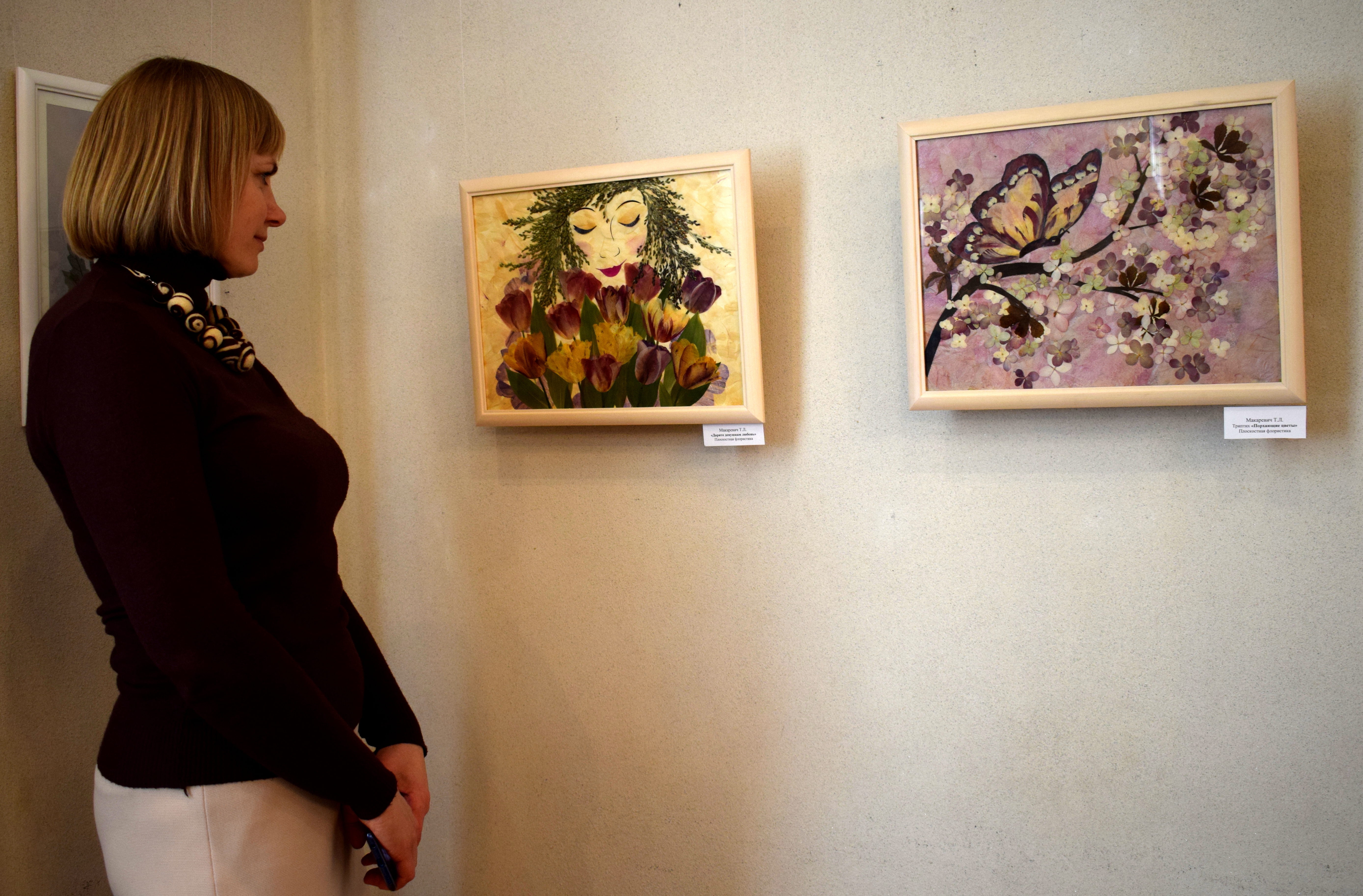 Зимней порой стоит полюбоваться на картины из нежных цветочных побегов, красочных лепестков ирисов, тюльпанов, анютиных глазок, незабудок и невольно ощутишь приближение весны. На выставке можно увидеть более полусотни флористических работ из высушенных природных материалов, выполненных с использованием разных техник – декупажа, графики, фитоколлажа и других. Мастерицы вложили в них всю свою тягу к созиданию, доброту и трудолюбие.