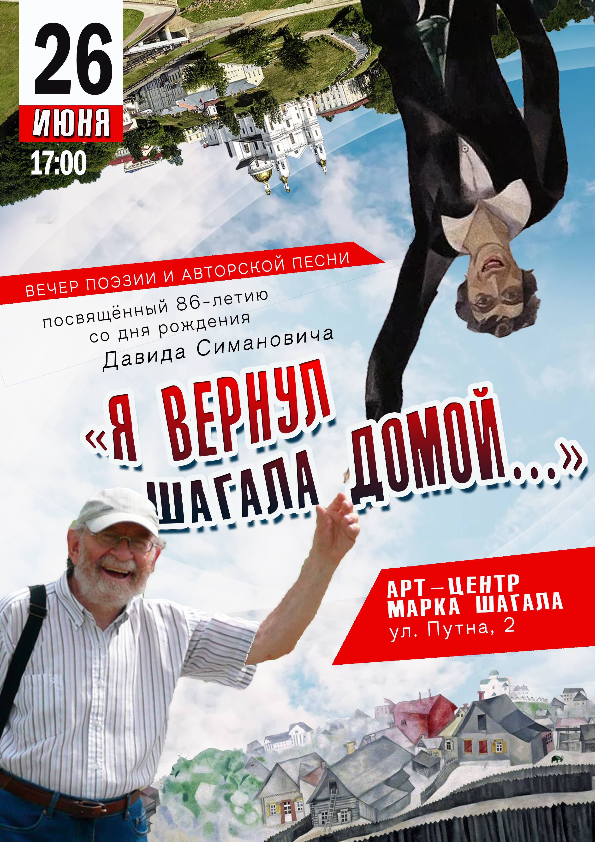 Вечер поэзии и авторской песни, посвященный 86-летию со дня рождения Давида Симановича, состоится 26 июня в Арт-центре Марка Шагала (начало в 17.00).